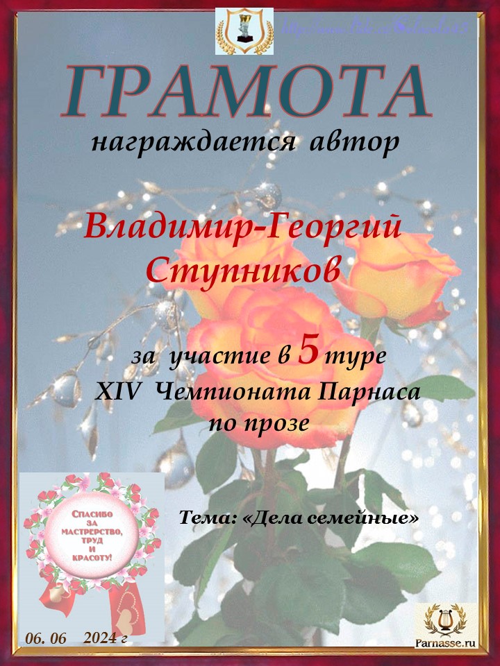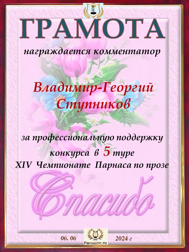 Спасибо за литературную поддержку конкурса и творческий вклад в 5 тур XIV Чемпионате Парнаса по прозе!