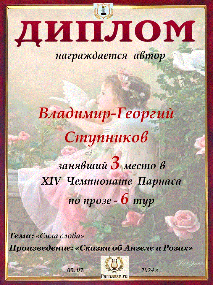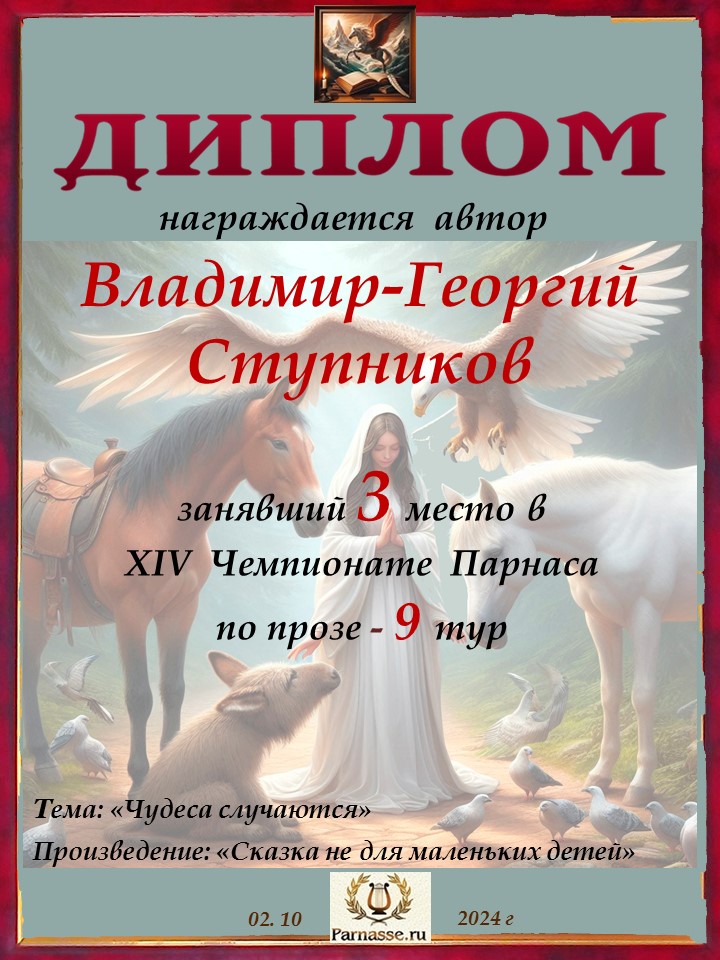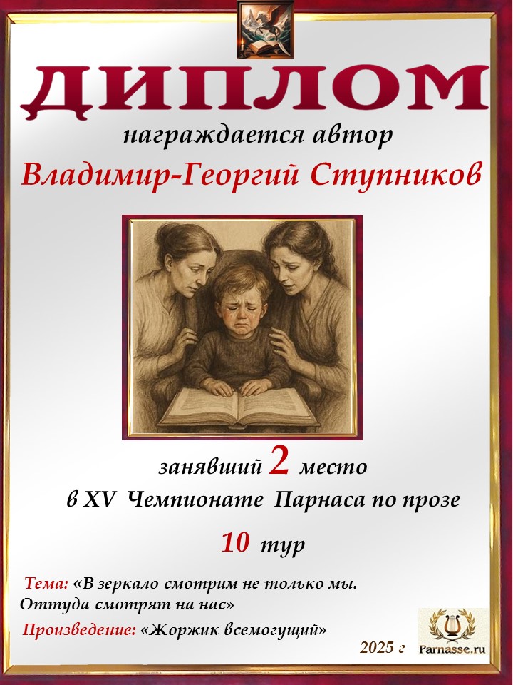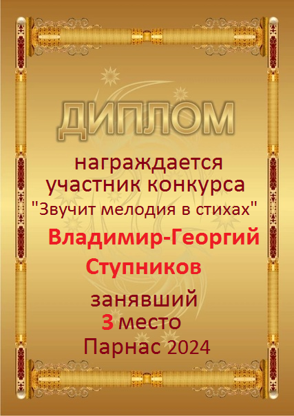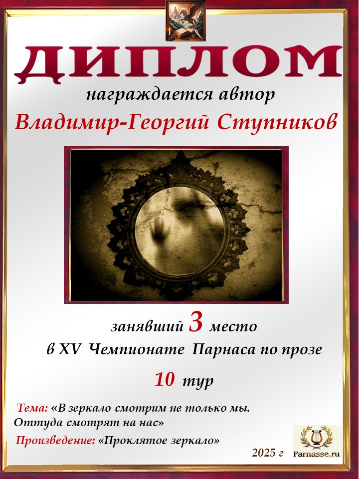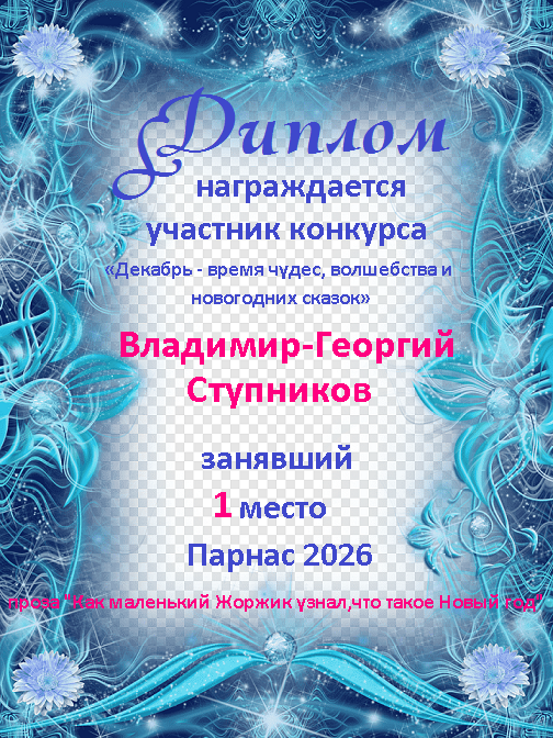 Поздравляю с занятым 3 местом в 11 туре XIV Чемпионата Парнаса по прозе!Георгий, Вы зря убрали свои работы. Они не хуже выставленных.