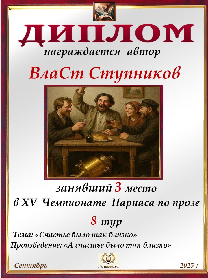 Поздравляю с занятым 3 местом в 8 туре XV Чемпионата Парнаса по прозе!