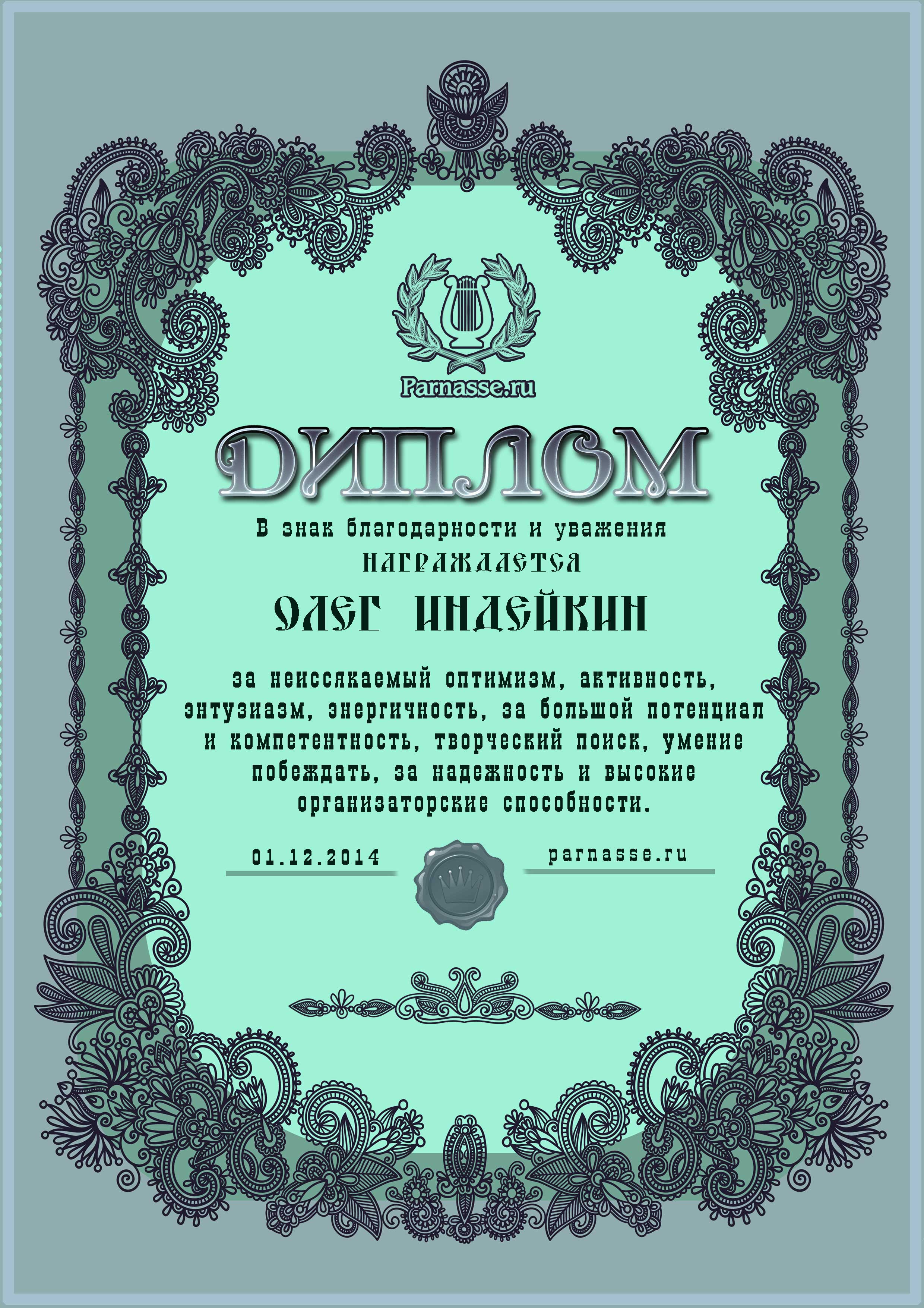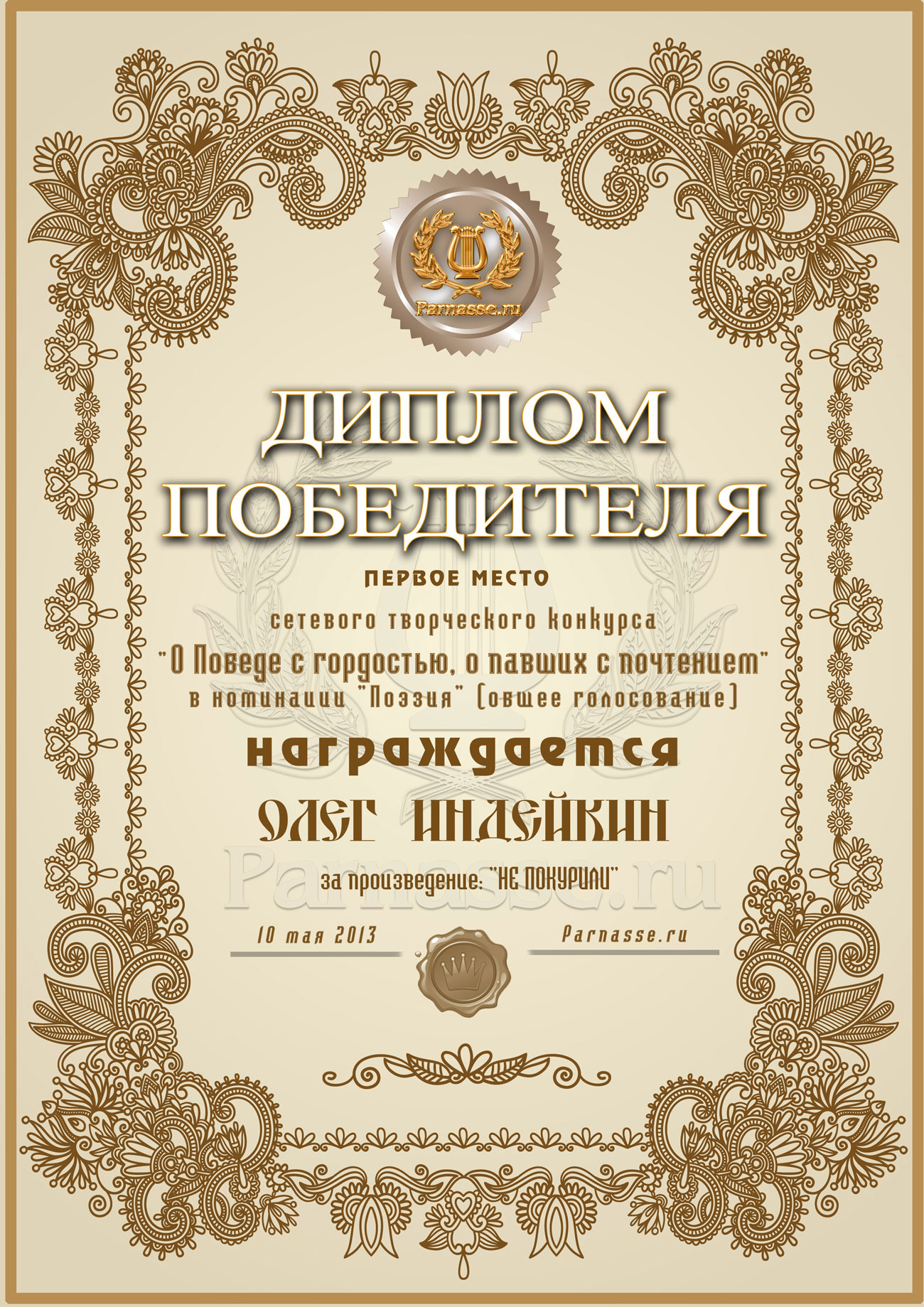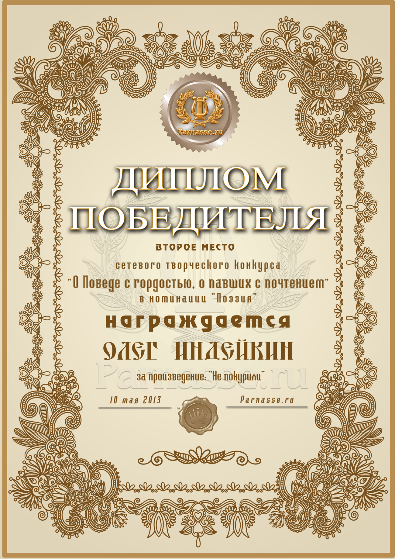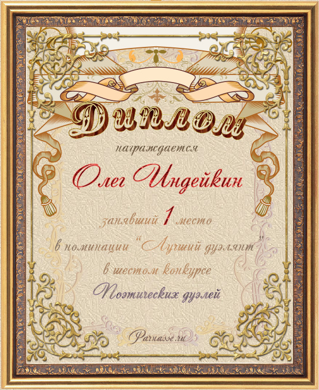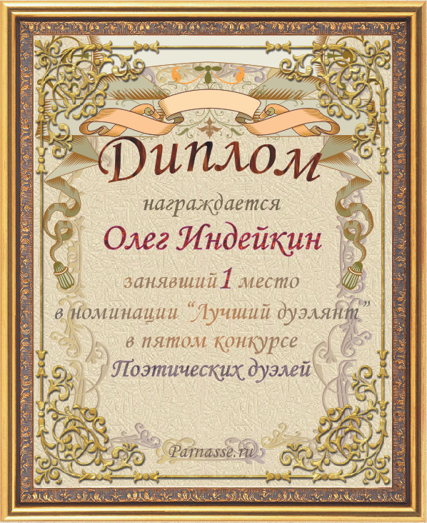 Диплом за победу в номинации "лучший дуэлянт" в пятом конкурсе поэтических дуэлей