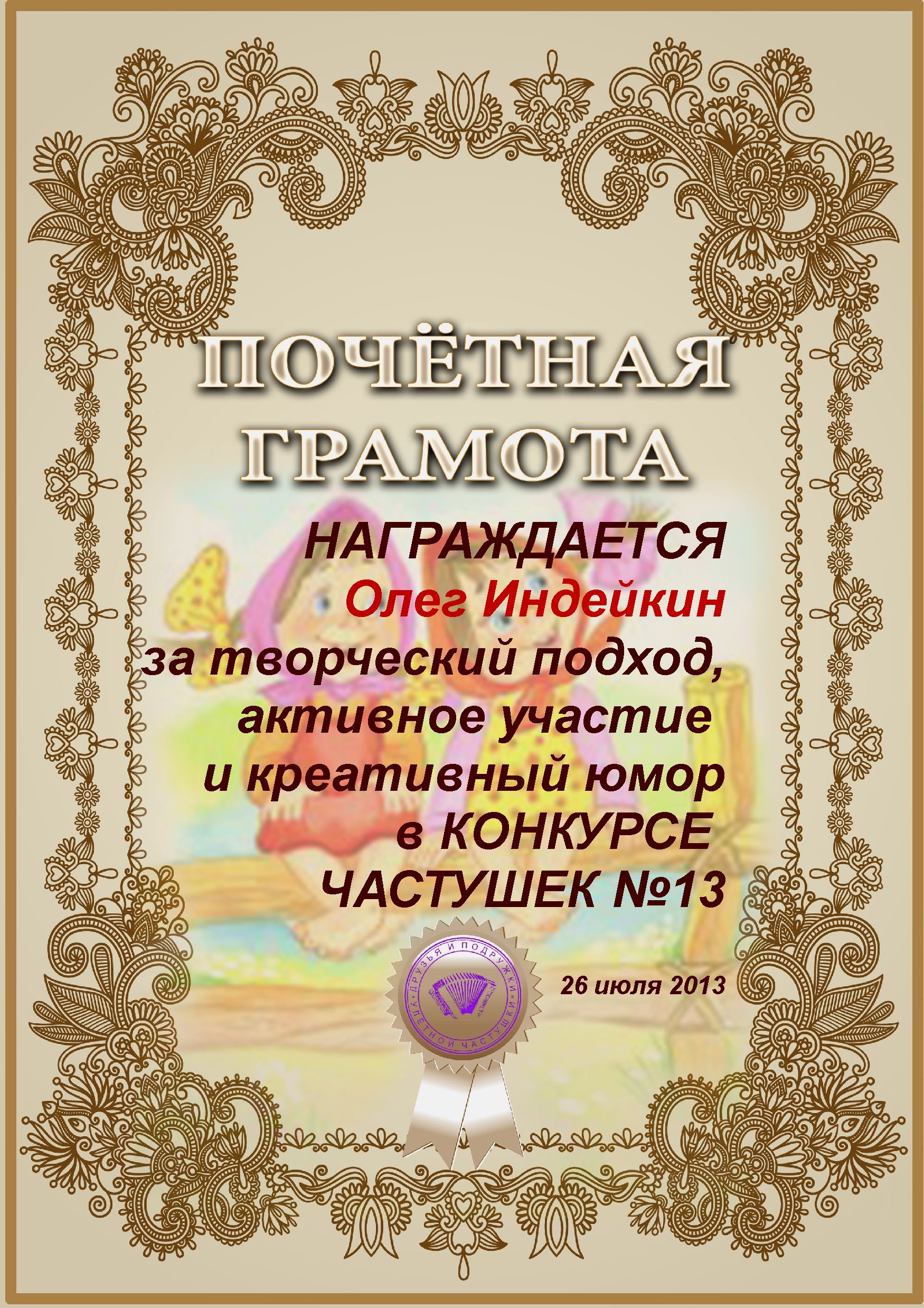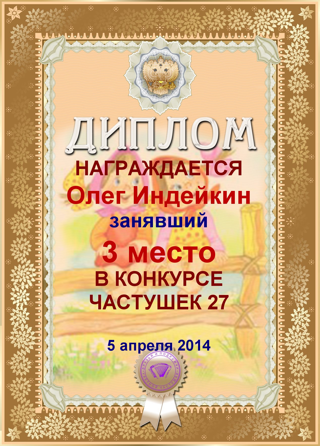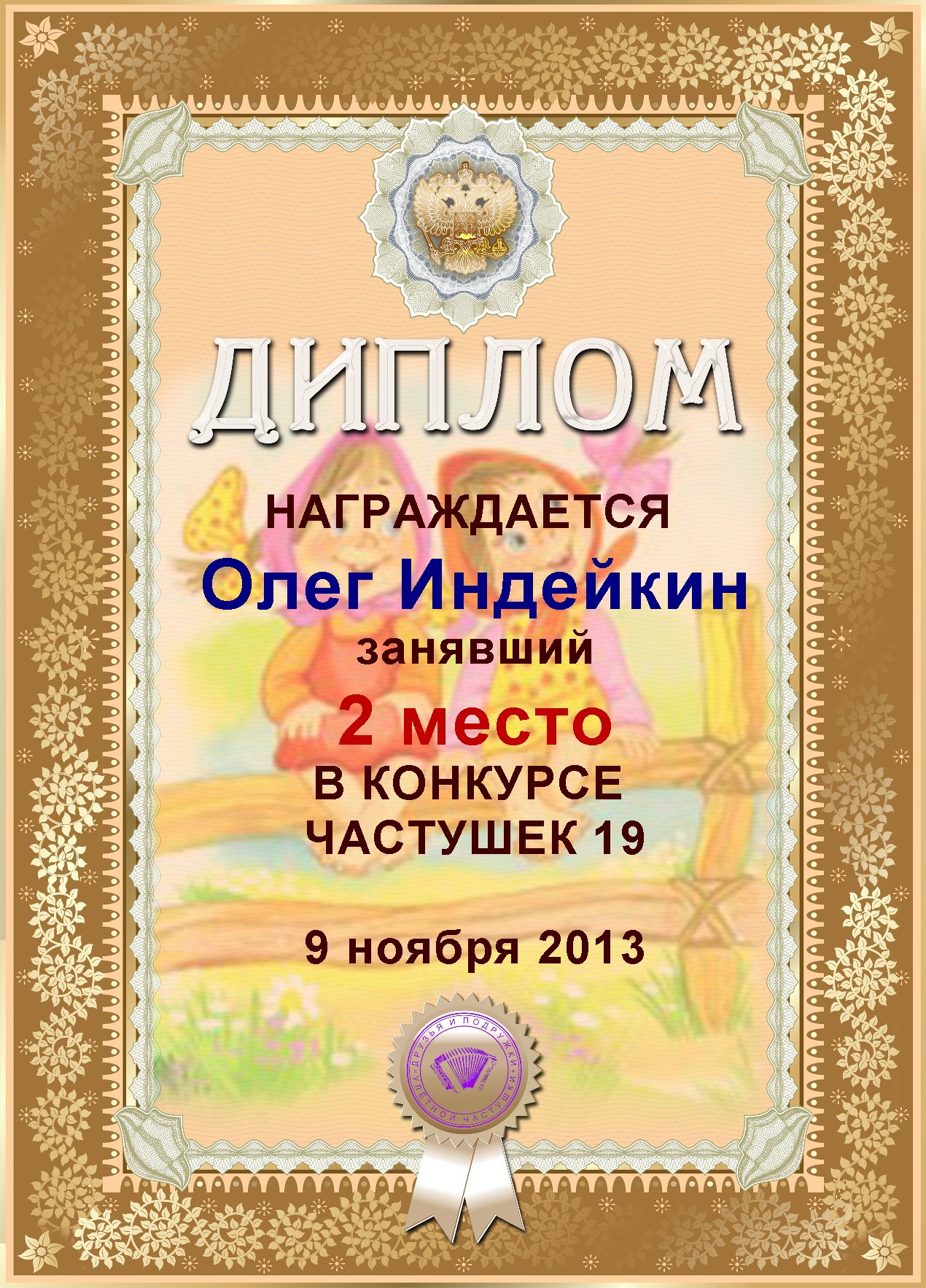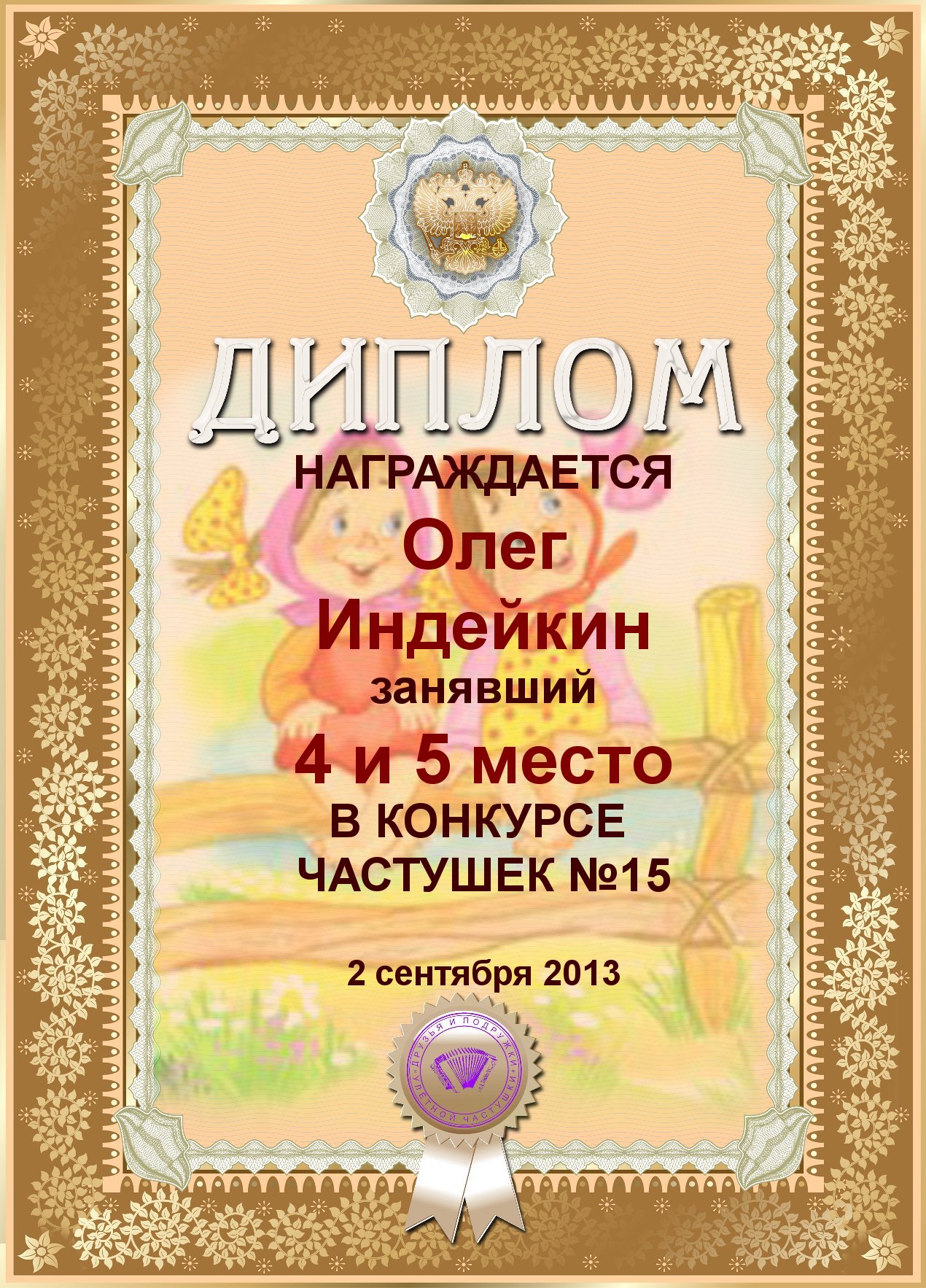 ОЛЕГ, ПОЗДРАВЛЯЮ ВАС С ПОЧЕТНЫМ 5 МЕСТОМ В КОНКУРСЕ ЧАСТУШЕК №9++