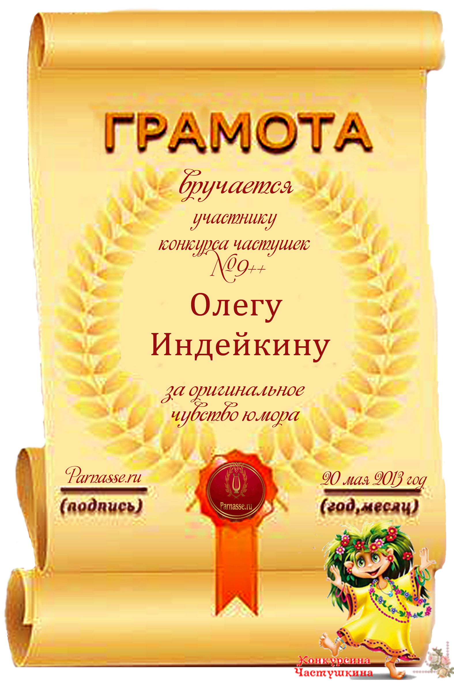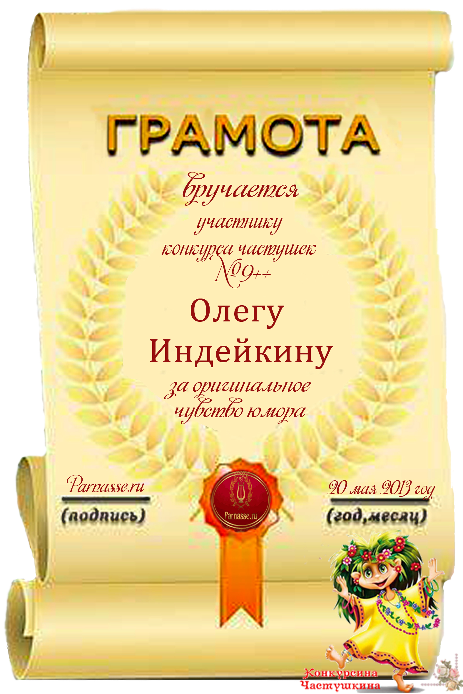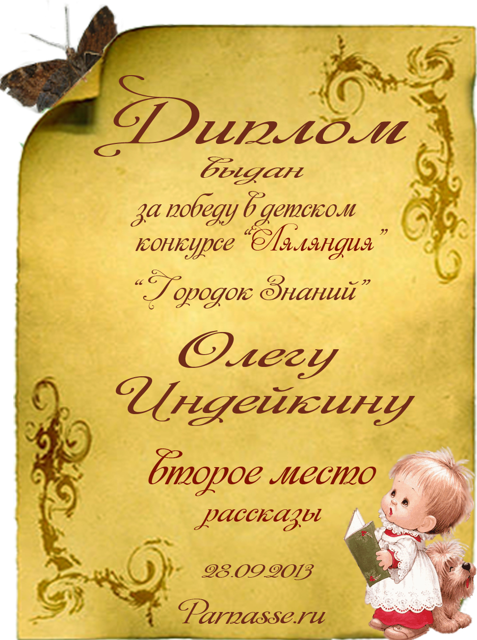 Диплом за победу и 1 место в дополнительной номинации конкурса лимериков № 42+ (30.09.2013 г.)