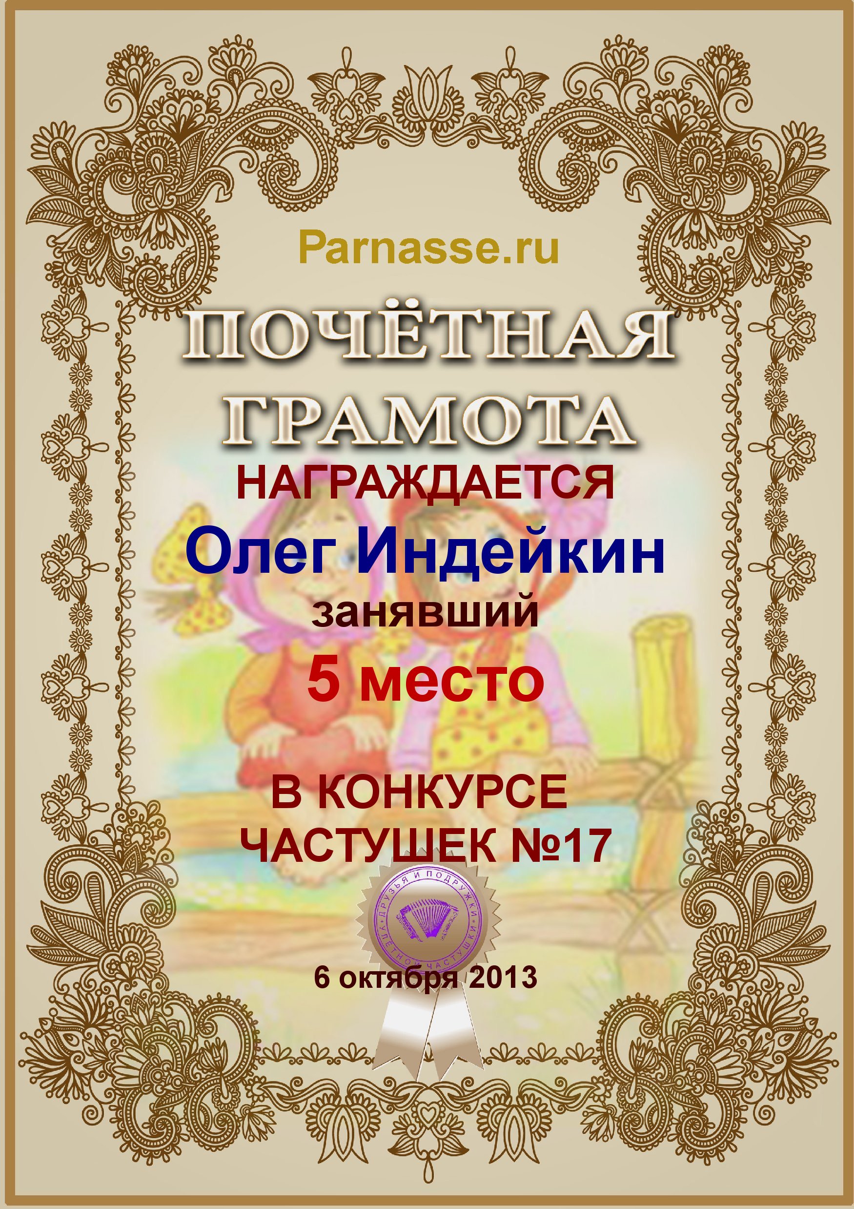 Похвальная грамота за 5 место в конкурсе лимериков № 43+ (21.10.2013 г.)