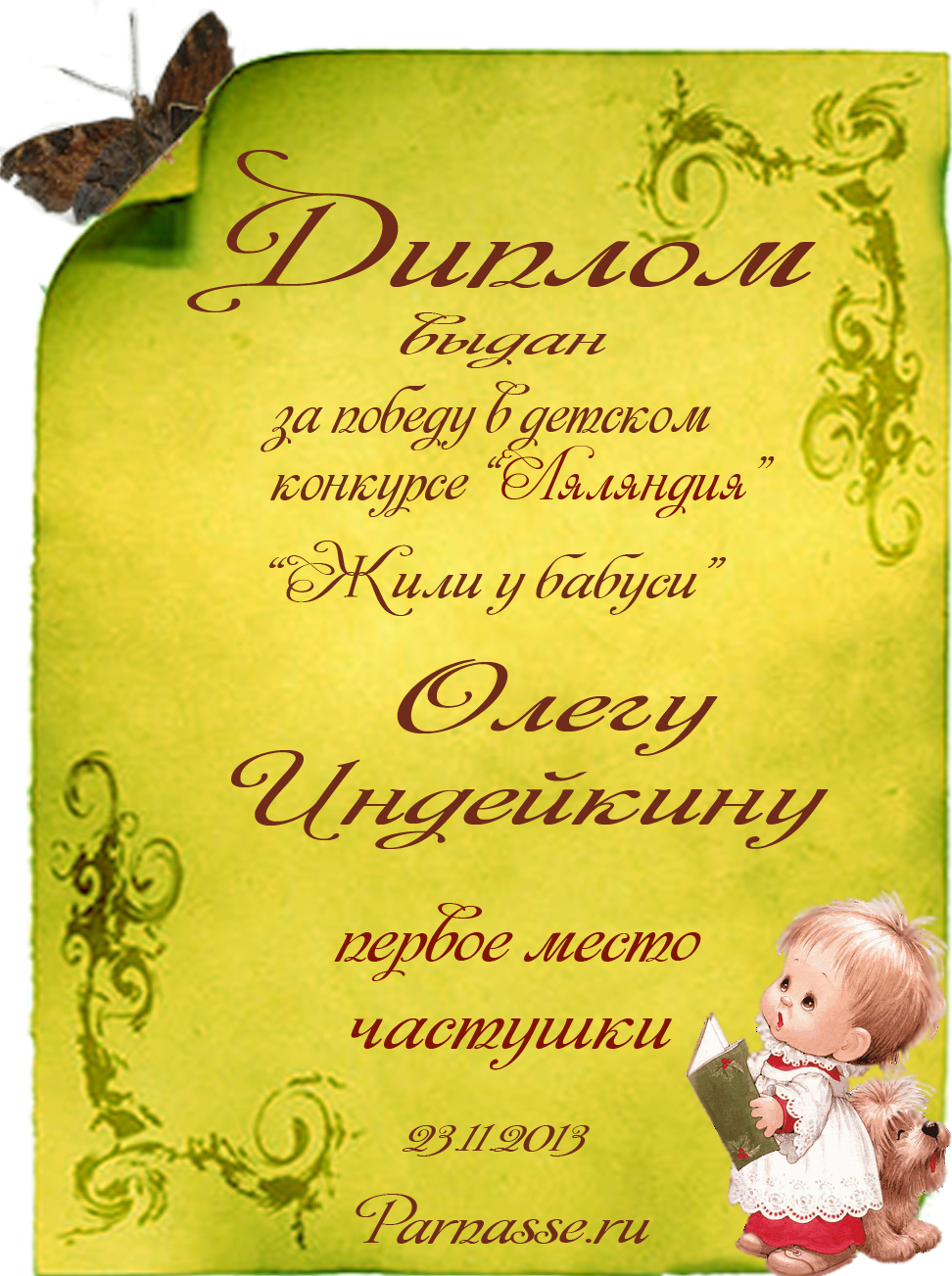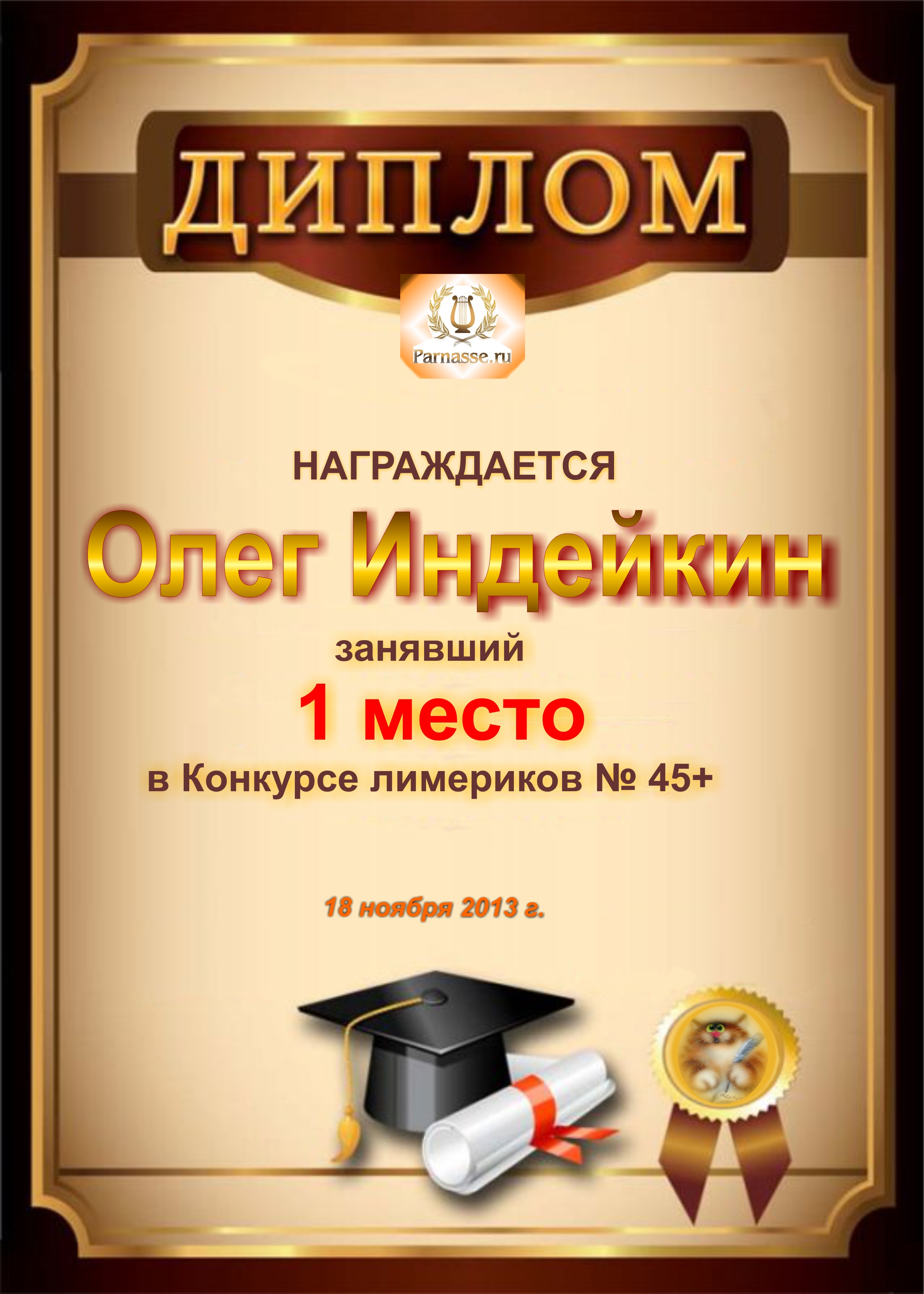 Диплом за победу и 1 место в конкурсе лимериков № 45+ (18.11.2013 г.)