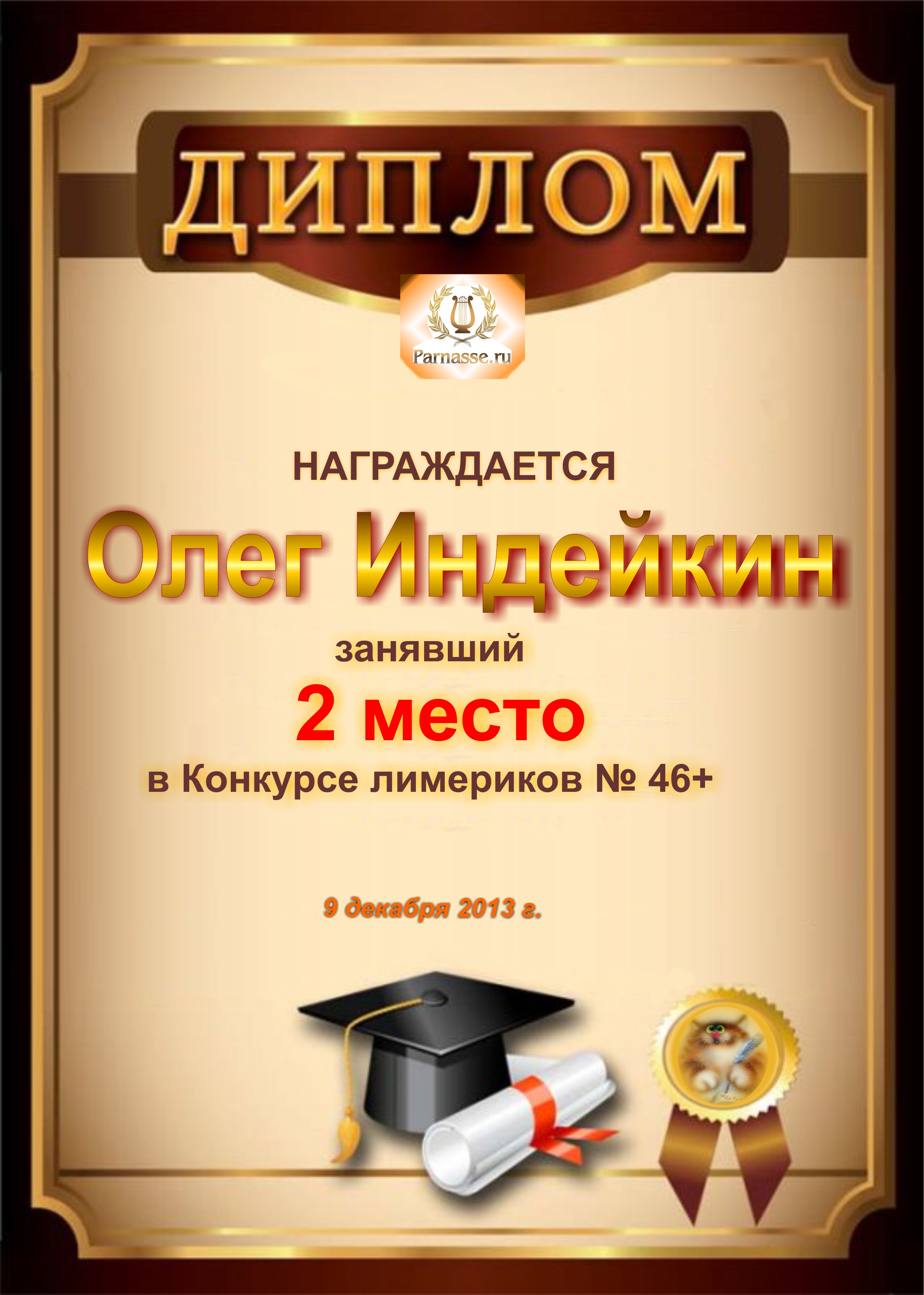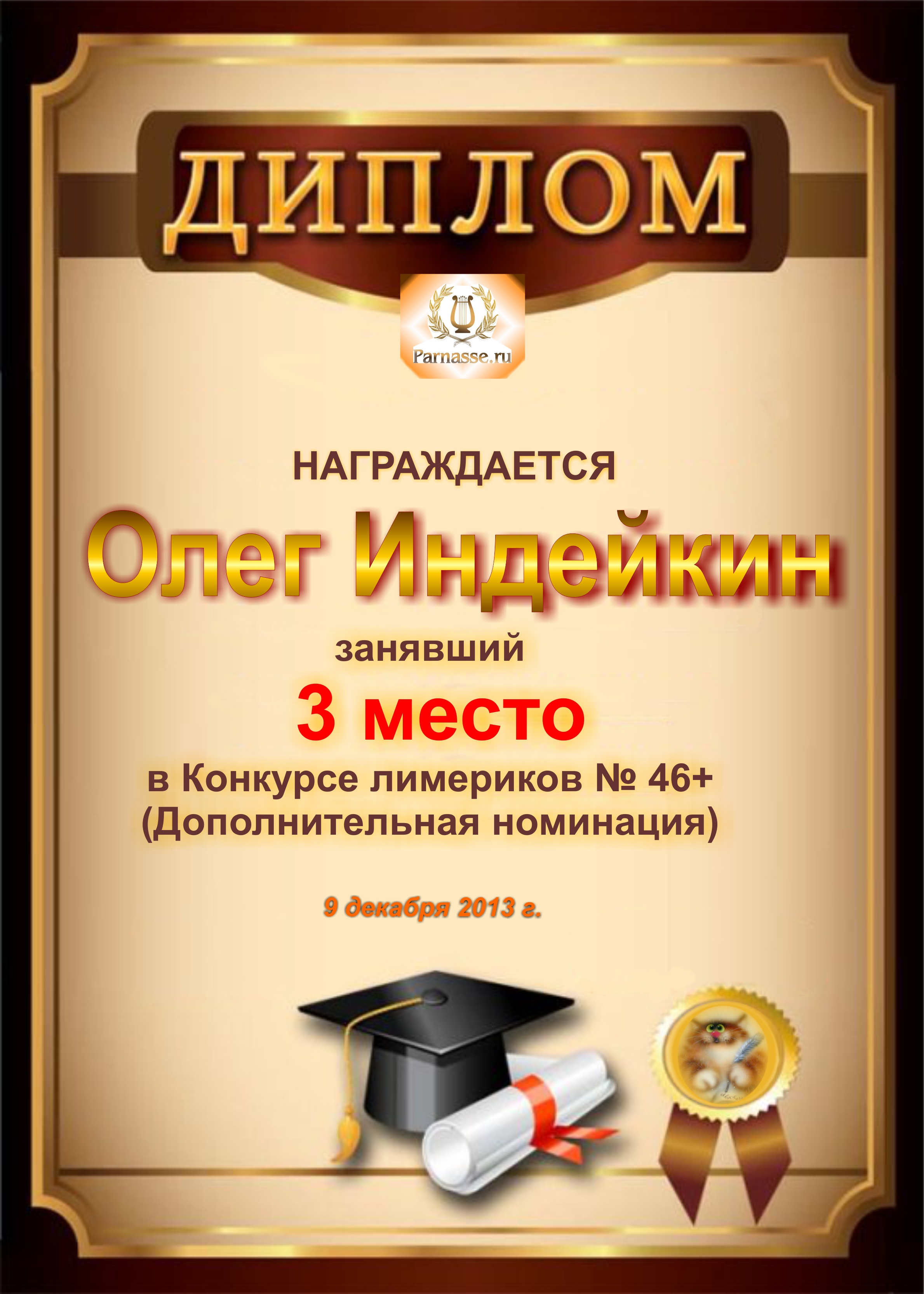 Диплом за победу и 3 место в дополнительной номинации конкурса лимериков № 46+ (9.12.2013 г.)