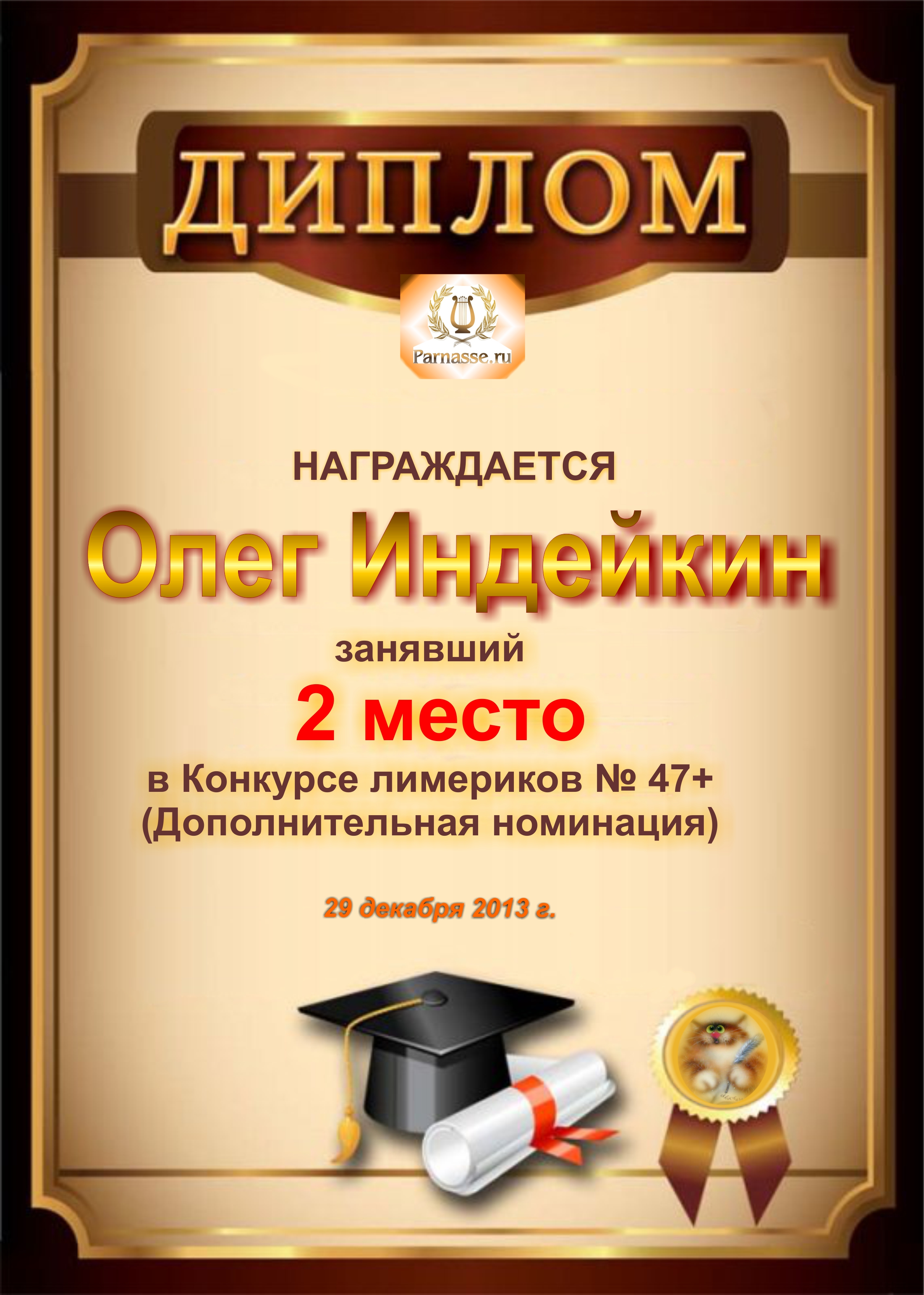 Диплом за победу и 2 место в дополнительной номинации конкурса лимериков № 47+ (29.12.2013г.)