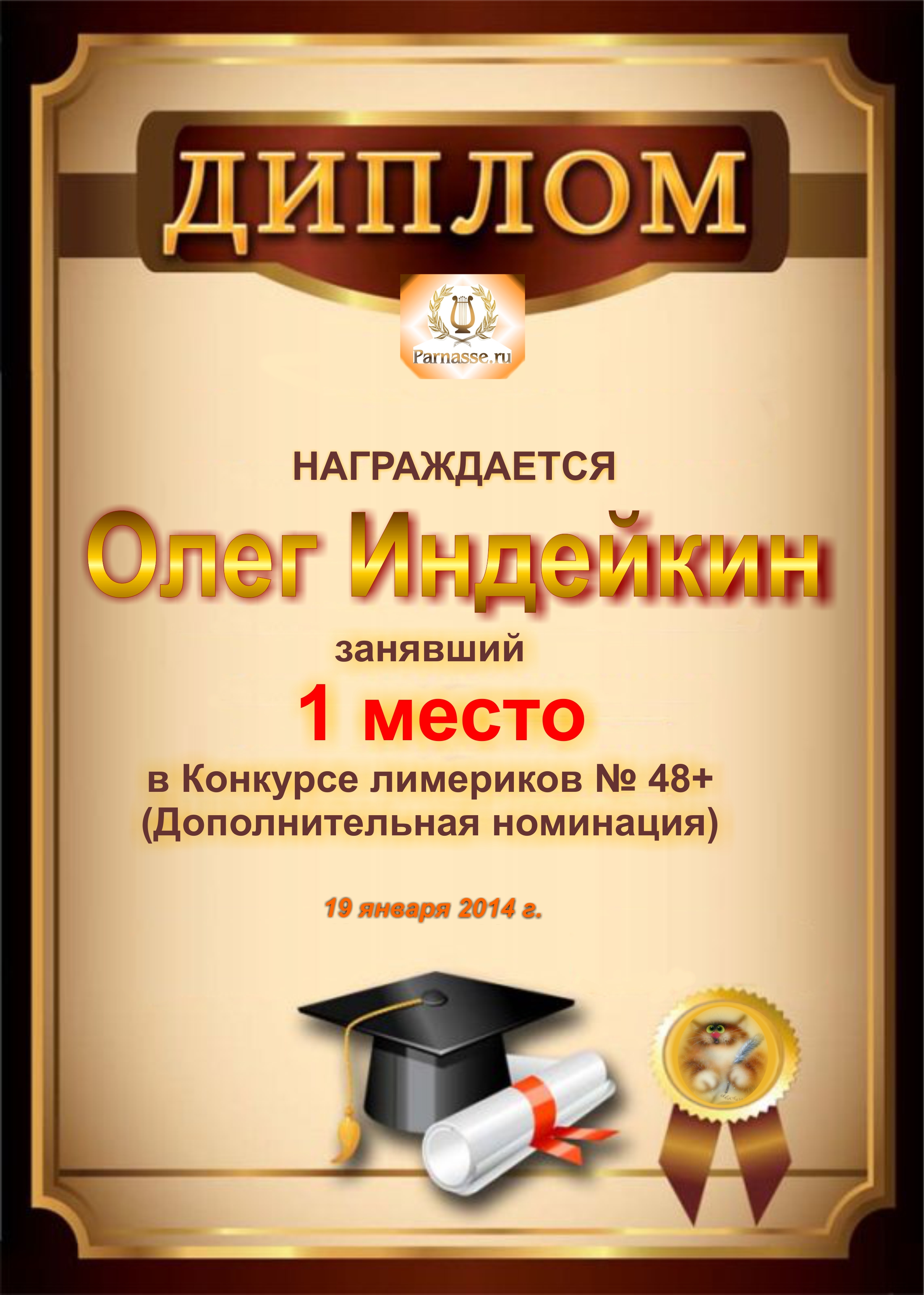 Диплом за победу и 1 место в дополнительной номинации конкурса лимериков № 48+ (19.01.2014г.)
