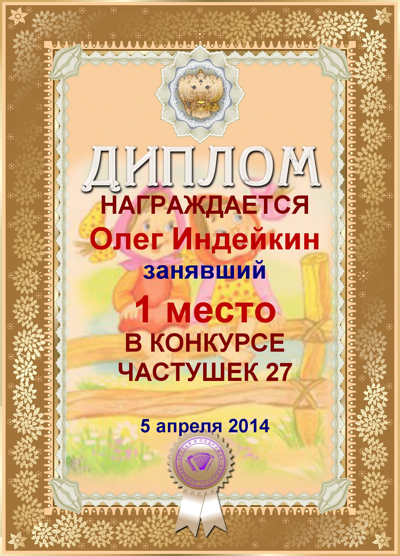 Диплом за 1 место в детском конкурсе "Жили у бабуси"