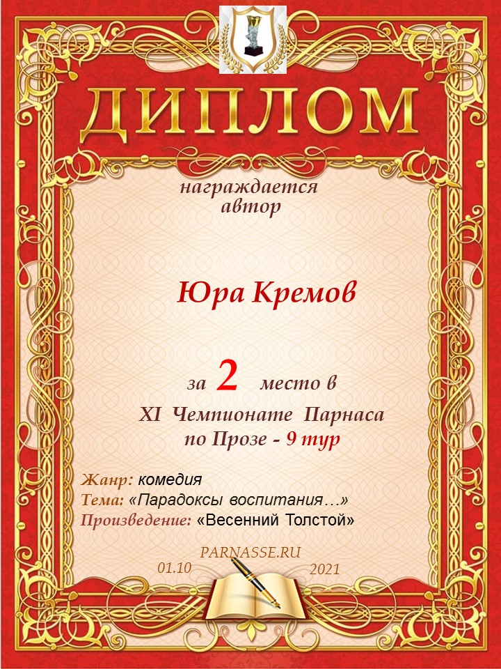 Вручается за 2 место в конкурсе XI Чемпионат Парнаса по прозе - 9 тур