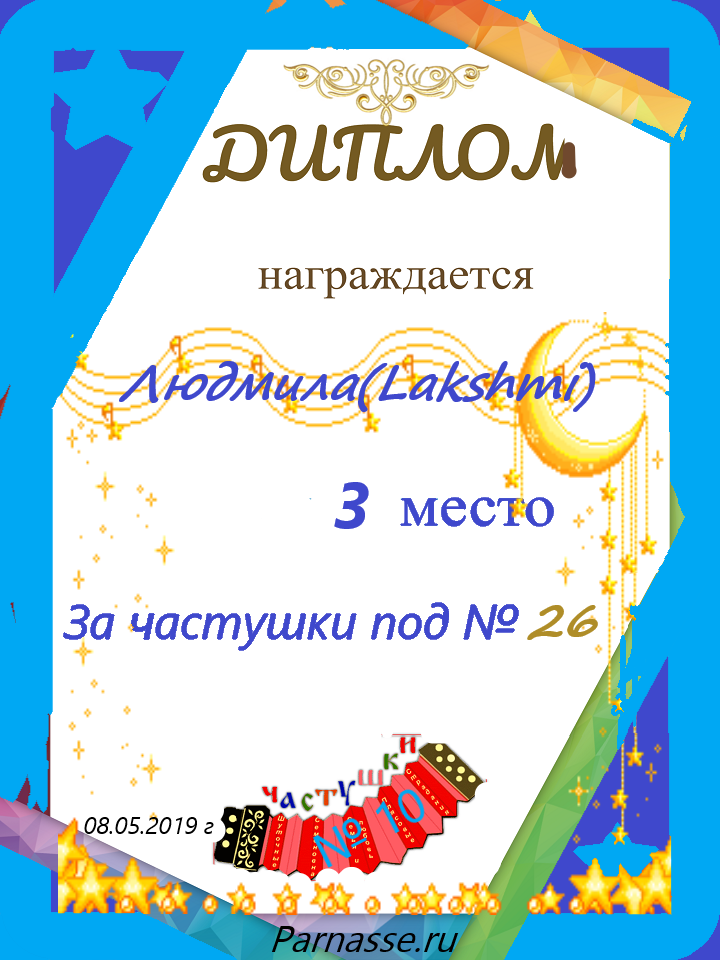 Дорогая Людмила! Выражаем Вам огромную благодарность за оказанную помощь Парнасу. Звезда на небе, исполняющая желания — эта та малость, которую Вы заслуживаете. Пусть Ваша красота подобно этой звезде сияет очень долго и обворожительно! И с каждым днем мечты пусть удивительно быстро исполняются!