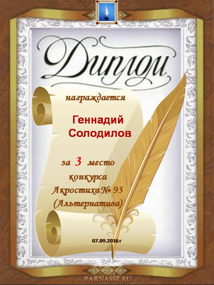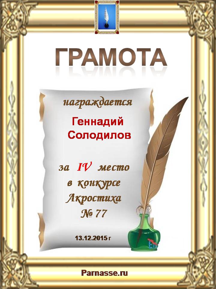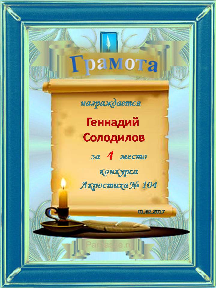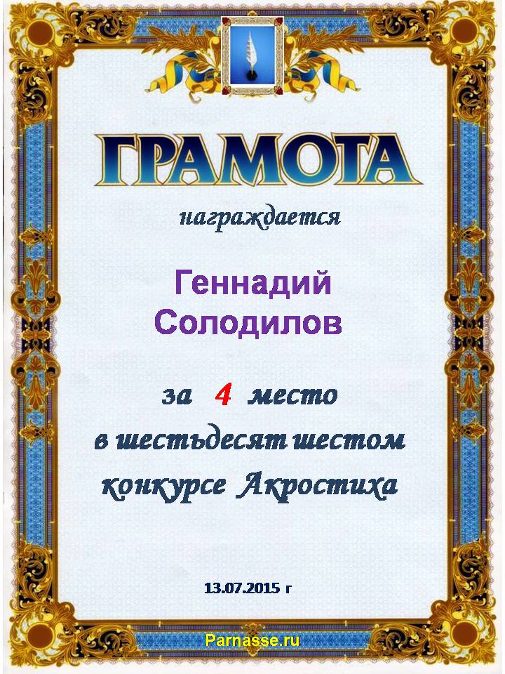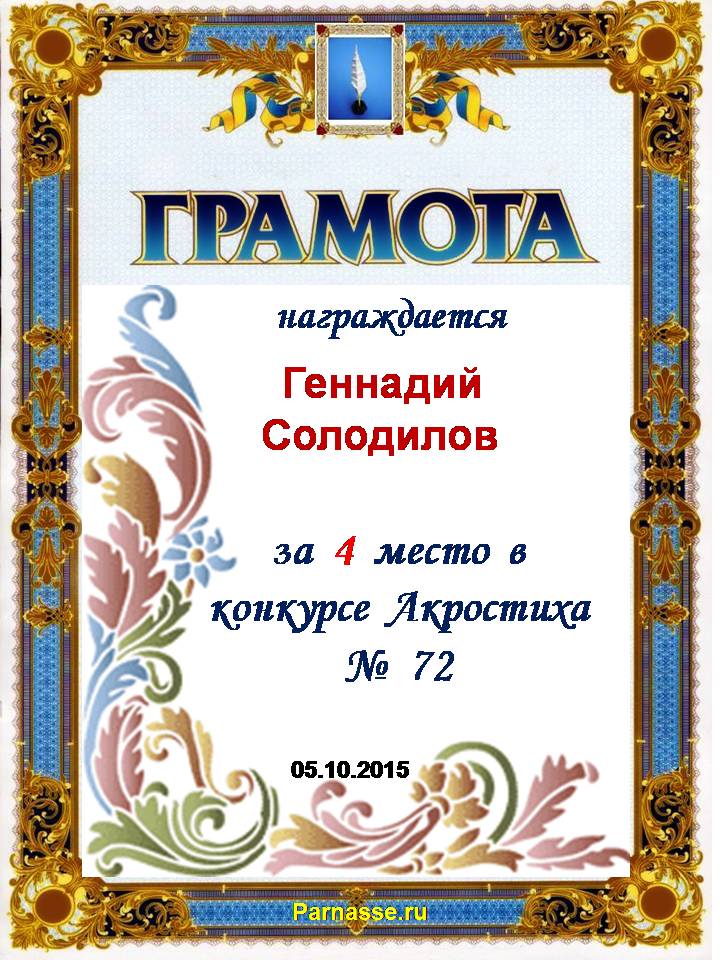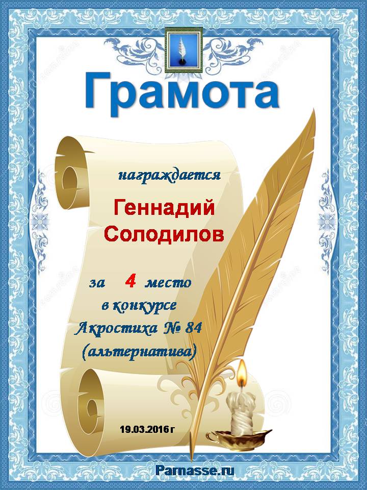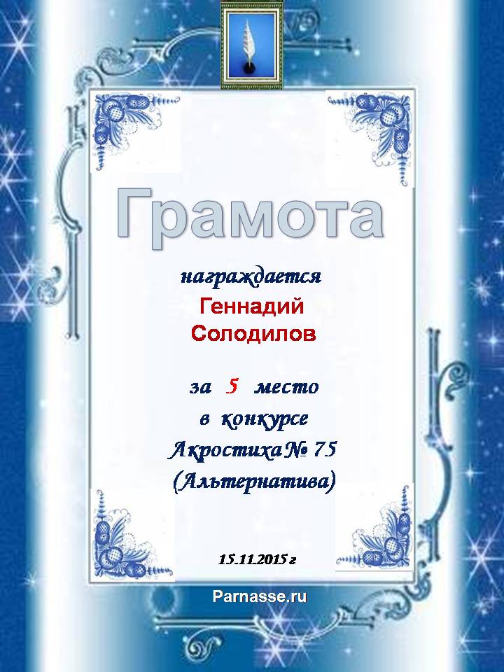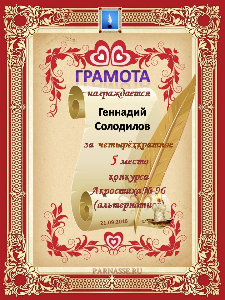 Грамота за четырехкратное 5 место в 96 конкурсе АКРОСТИХА (Альтернатива)! ПОЗДРАВЛЯЮ!
