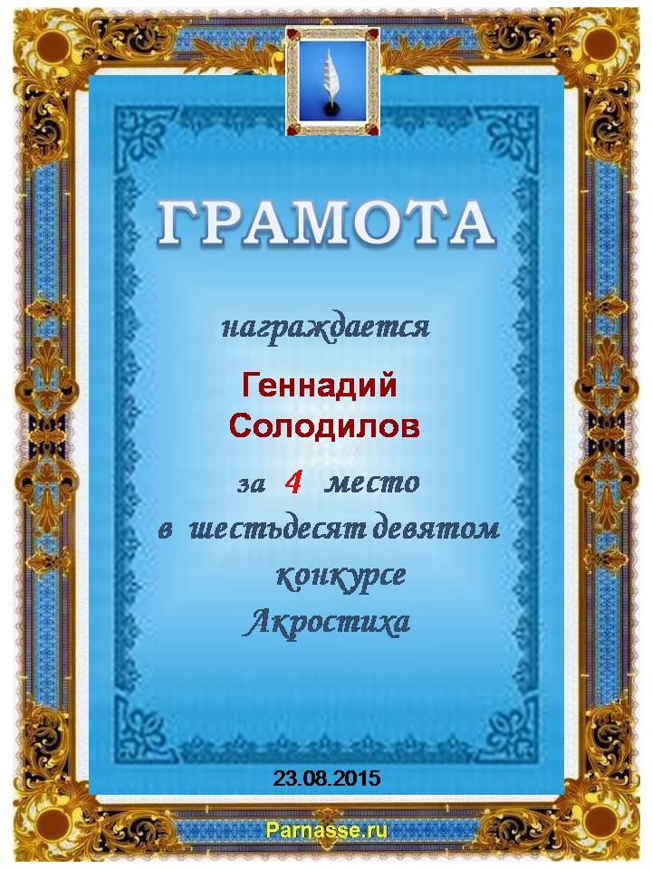 Грамота за двойное 4 место в 96 конкурсе АКРОСТИХА (Альтернатива)! ПОЗДРАВЛЯЮ!