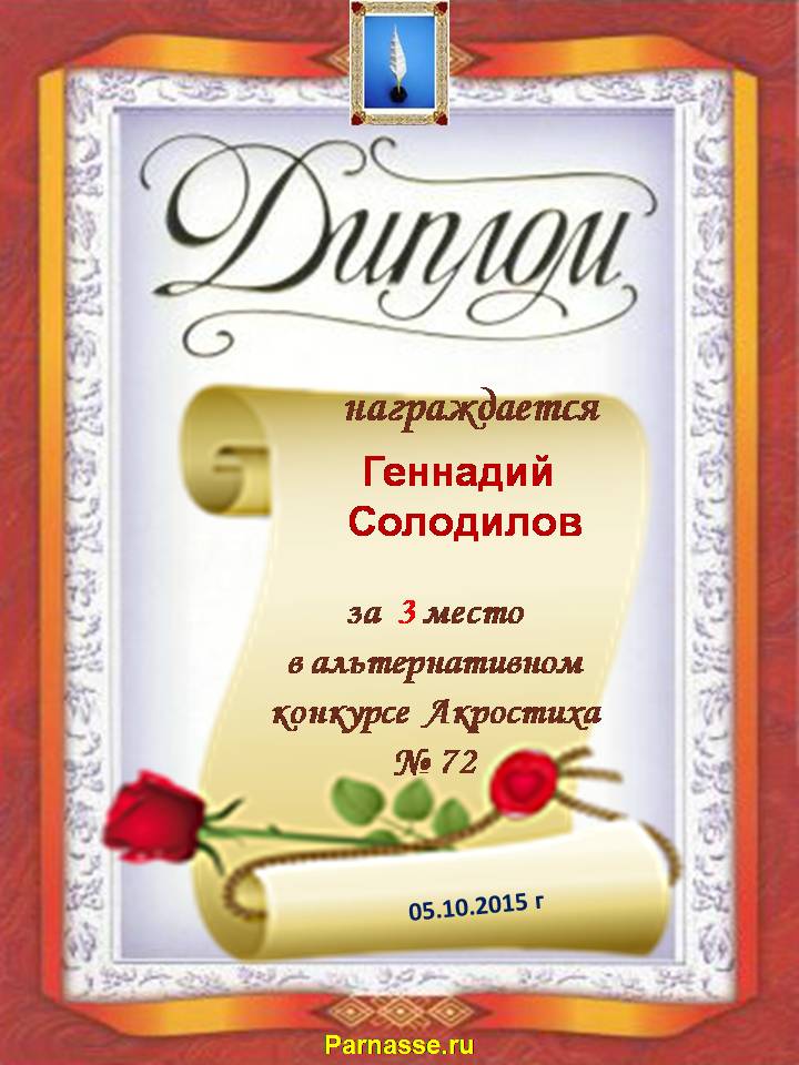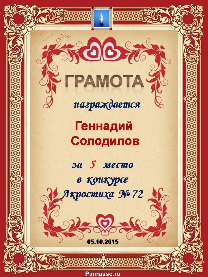 Грамота за 5 место в 107 конкурсе АКРОСТИХА (Альтернатива)! ПОЗДРАВЛЯЮ!