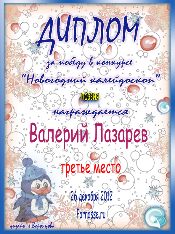 Первое место в праздничном конкурсе "ПОЗДРАВИМ ПАРНАС ВМЕСТЕ!", в номинации "Лучшее стихотворное поздравление Парнасу". Позвольте от всей души выразить Вам благодарность за прекрасные поэтические слова поддержки, самые тёплые пожелания нашему Парнасу и пожелать Вам новых побед на литературном поприще, успехов в жизни и всех Ваших начинаниях! Будьте счастливы, здоровы, пусть удача не покидает Вас ни на минуту и от всей души СПАСИБО! Оставайтесь с нами и мы будем вновь и вновь встречать Дни рождения "Парнаса" в одной дружной, душевной компании! Произведение "Нам три года"
