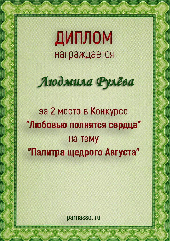 За 2 место в Конкурсе "Любовью полнятся сердца" на тему "Палитра щедрого Августа"