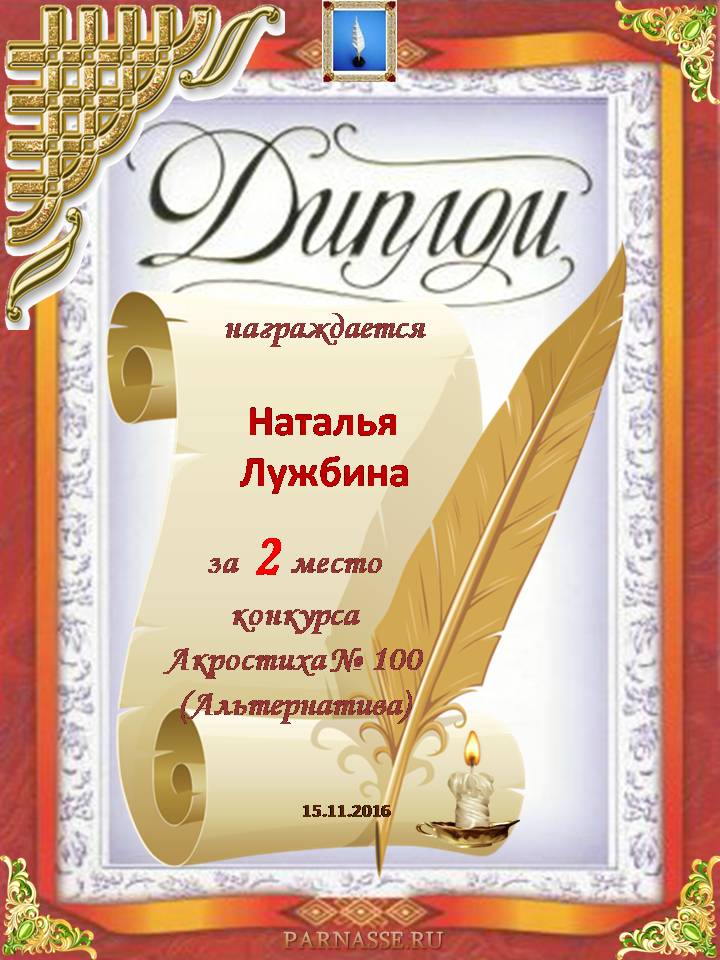 Диплом за 2 место в юбилейном конкурсе АКРОСТИХА № 100 (Альтернатива)!