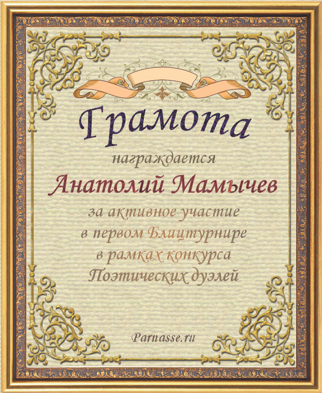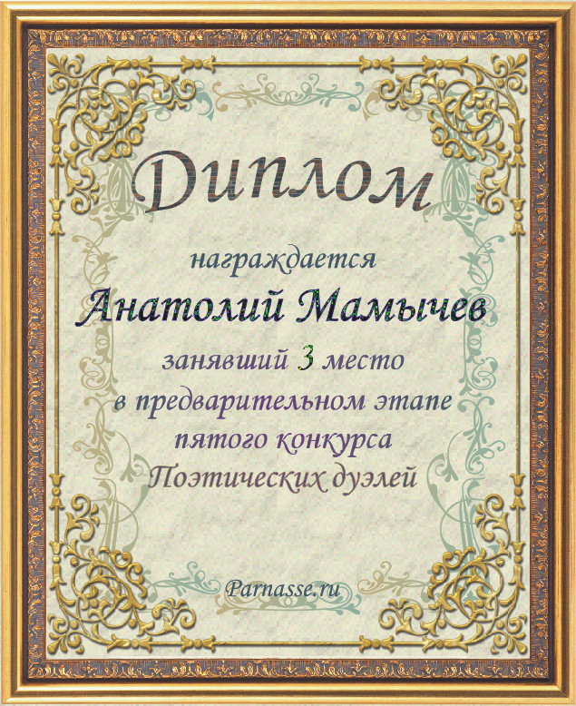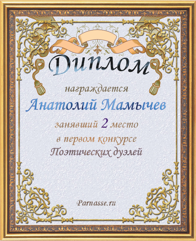«Анатолий, я от души поздравляю Вас с бронзовой победой в шестом конкурсе поэтических дуэлей!!!»