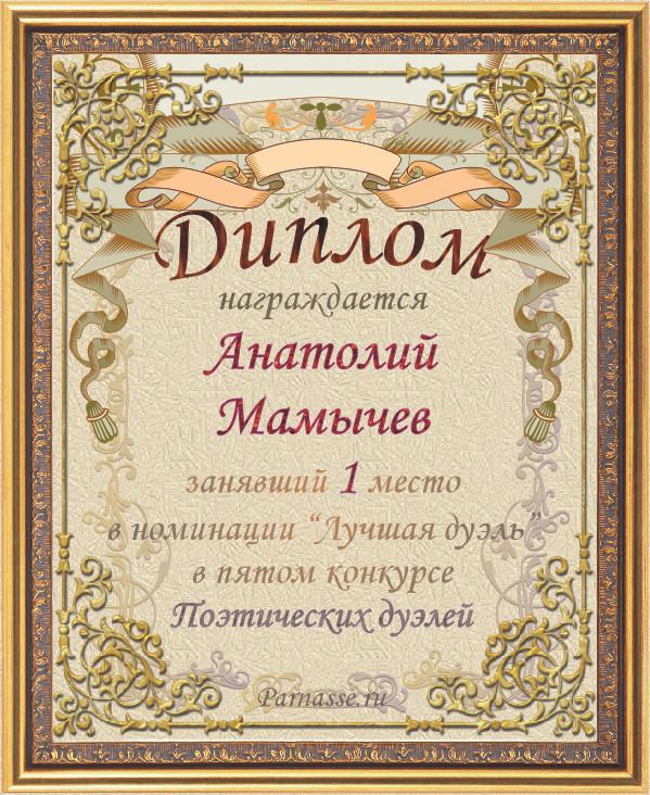 Диплом за победу в номинации "Лучшая дуэль" в пятом конкурсе Поэтических дуэлей