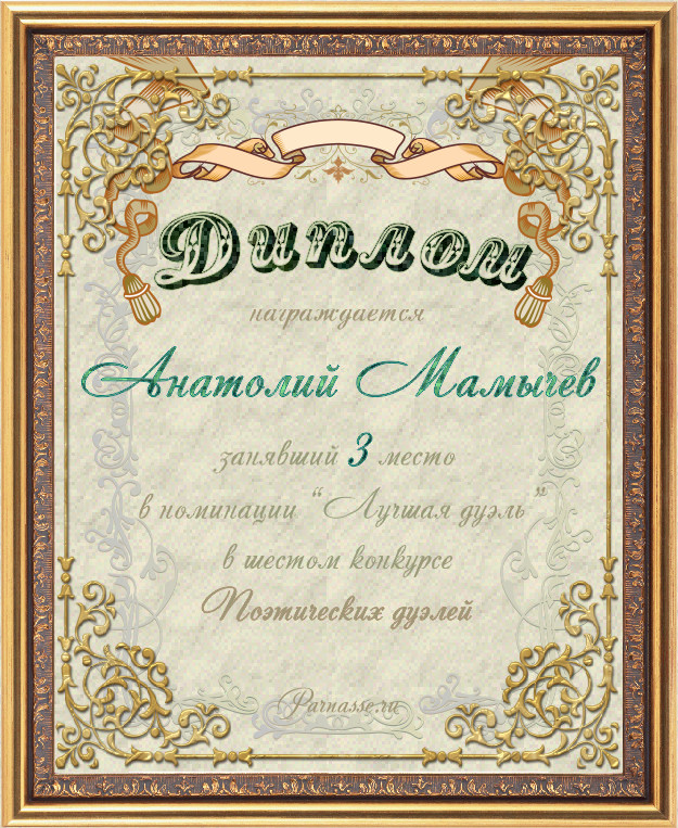 Диплом за 3-е место в номинации "Лучшая дуэль" в шестом конкурсе поэтических дуэлей