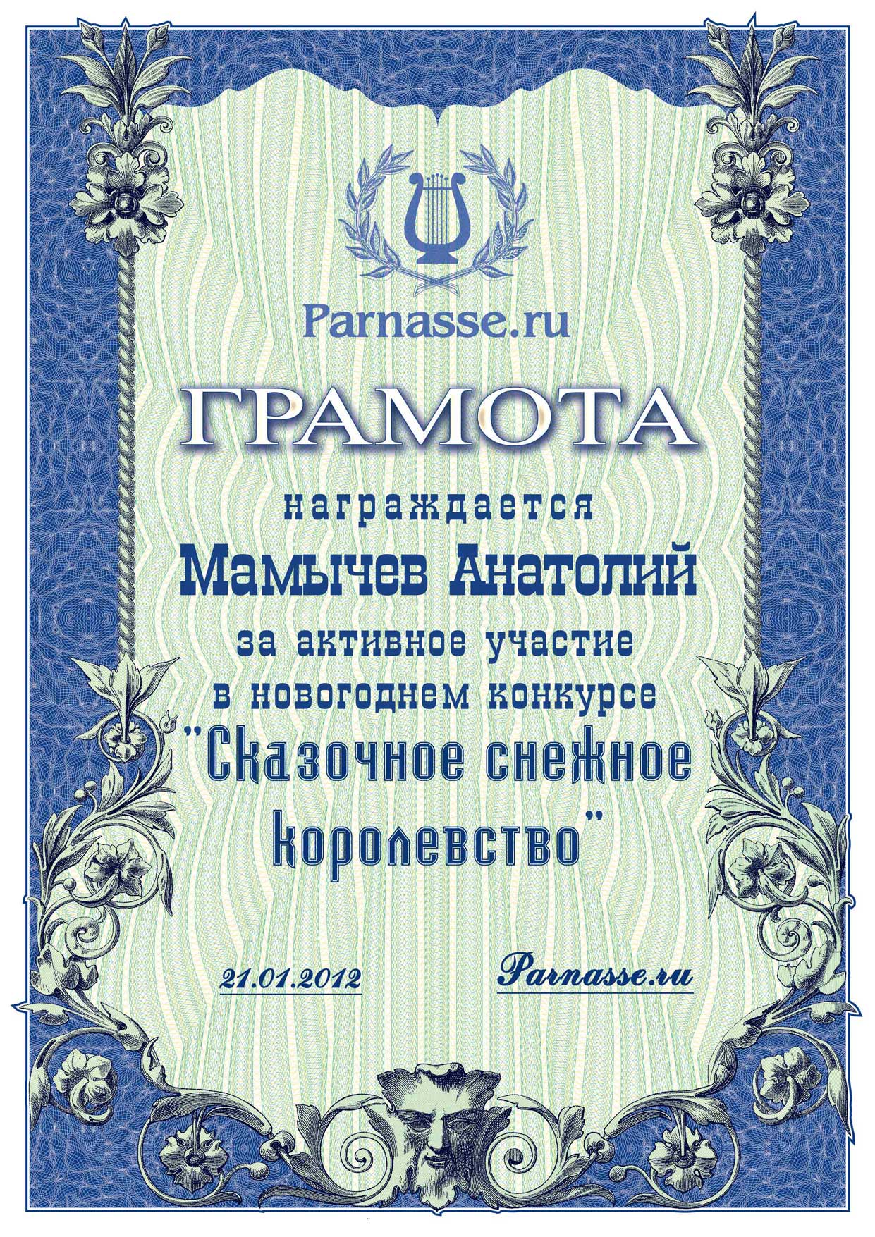 От лица Администрации творческого портала "Парнас" вручаем Вам этот памятный знак с самыми наилучшими пожеланиями! Пусть Вас весь год не покидает творческий запал, удача, а здоровье будет столь же крепким и нерушимым, как и традиция Новогоднего праздника! Счастья, успехов и любви Вам и Вашей семье, друзьям и близким!
