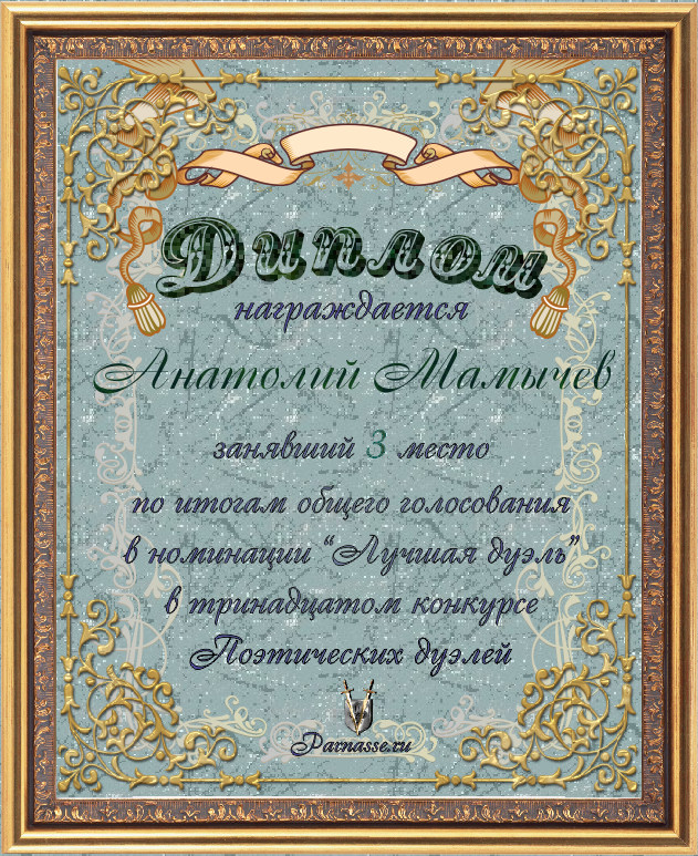 Диплом за 3-е место в номинации "ЛУЧШИЙ ДУЭЛЯНТ" по итогам судейского голосования в 13м конкурсе поэтических дуэлей