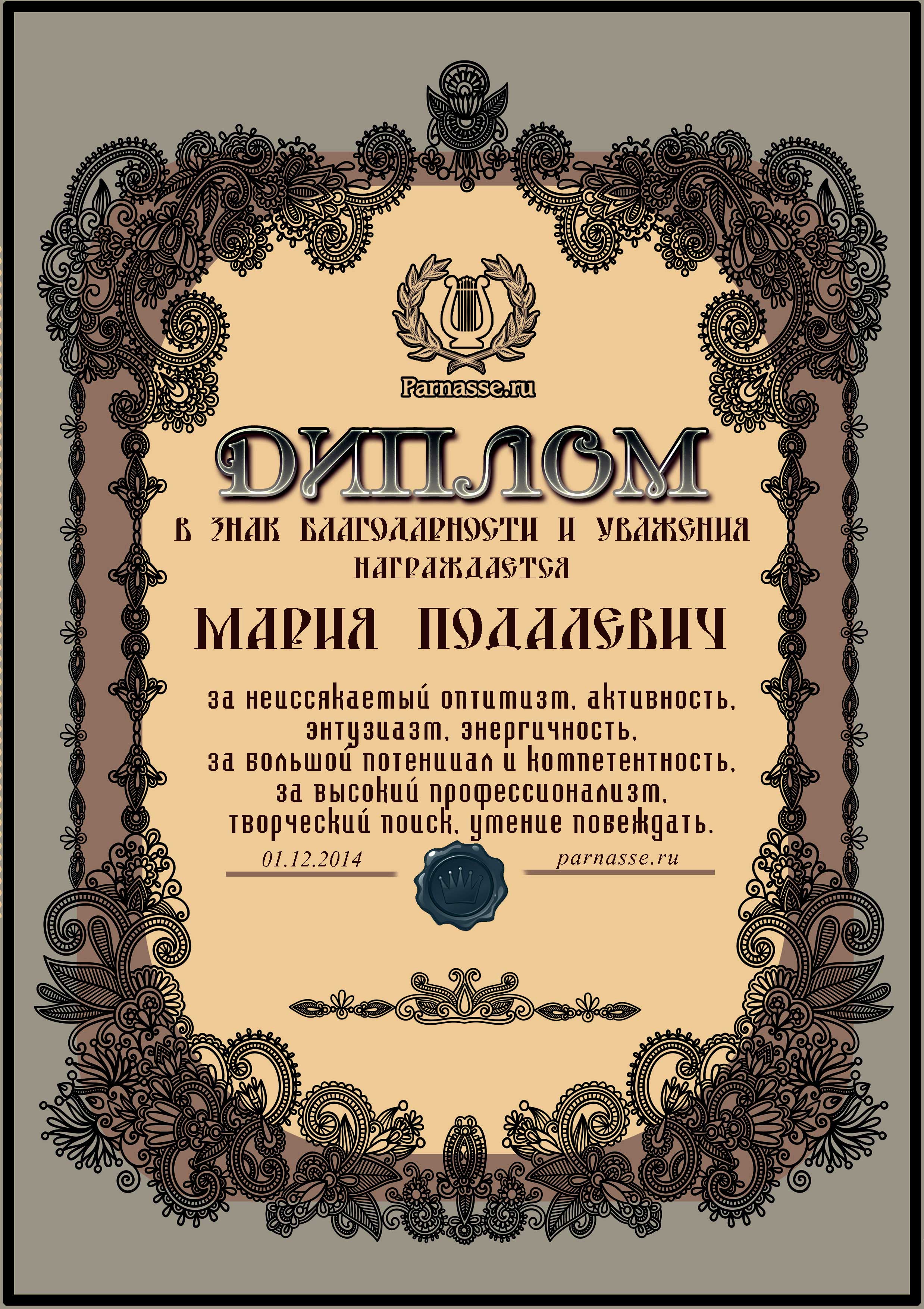 За неугасающую и неисчерпаемую творческую активность, постоянный контакт с Музой и признание сообществом "Парнасцев".От всей души желаем Вам, Мария, здоровья, любви, успехов, благополучия, удачи и творческого вдохновения!