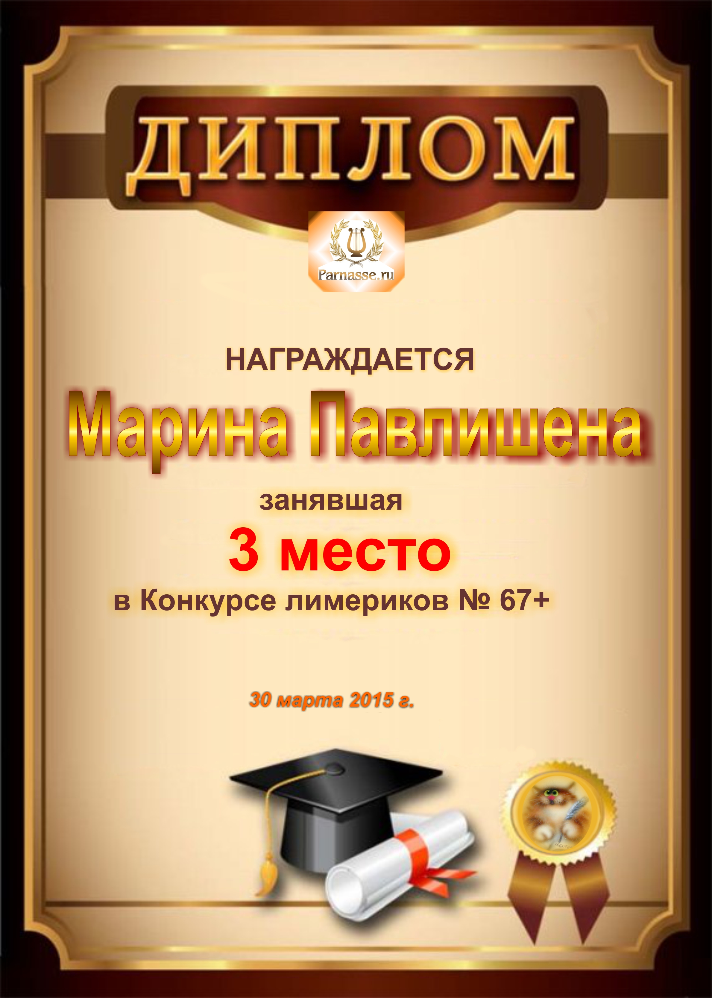 Похвальная грамота за 5 место в конкурсе лимериков № 66+ (2.03.2015 г.)