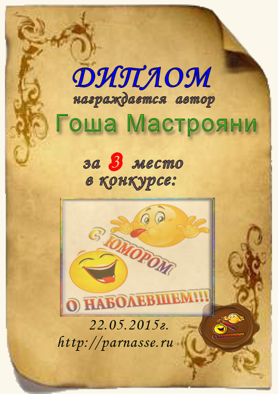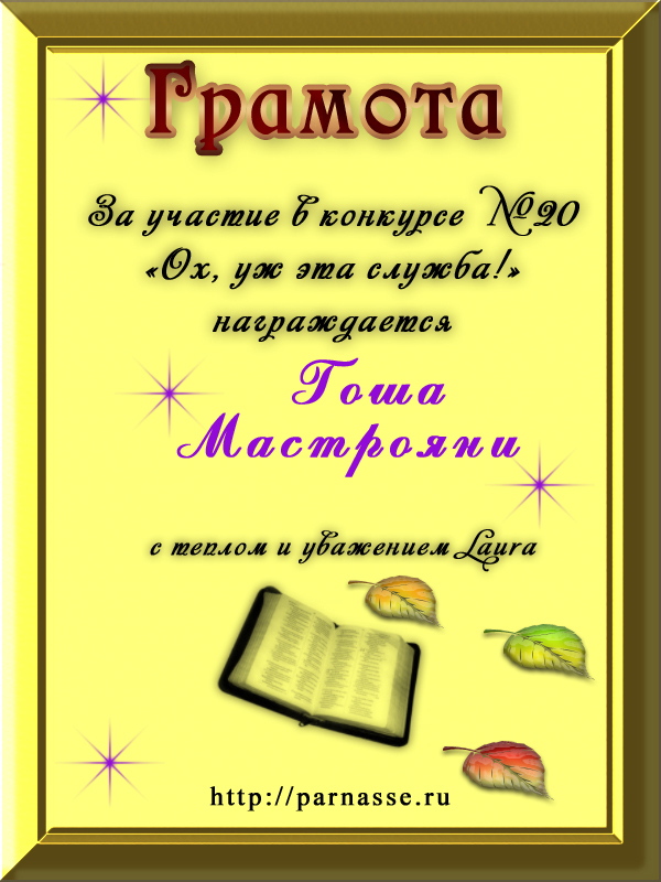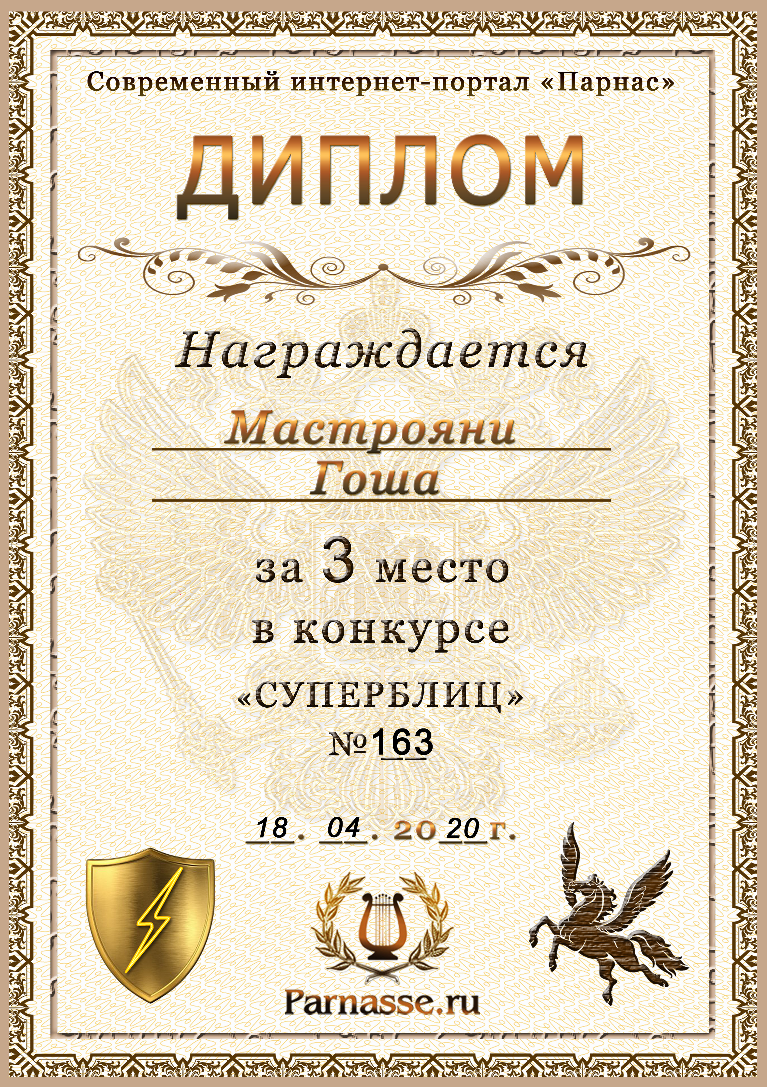Первое место в праздничном конкурсе "Поздравим Парнас вместе!", в номинации "Самое необычное поздравление Парнаса с Днём Рождения". Сердечно благодарим Вас за великолепные оригинальные поздравления и прекрасные пожелания нашему Парнасу! Мы рады, что Вы с нами, и желаем, чтобы Ваше творчество и впредь радовало нас своей красотой, легкостью, образностью и глубочайшим эмоциональным смыслом! Пусть удача всегда сопутствует Вам во всех начинаниях, а здоровье никогда не подводит, будьте всегда на пике творческой активности и мы с Вами встретим еще не одну годовщину сайта! Будьте счастливы и всегда готовы к новым свершениям на благо искусства! Произведение "Пряздрявляю... Пух!"