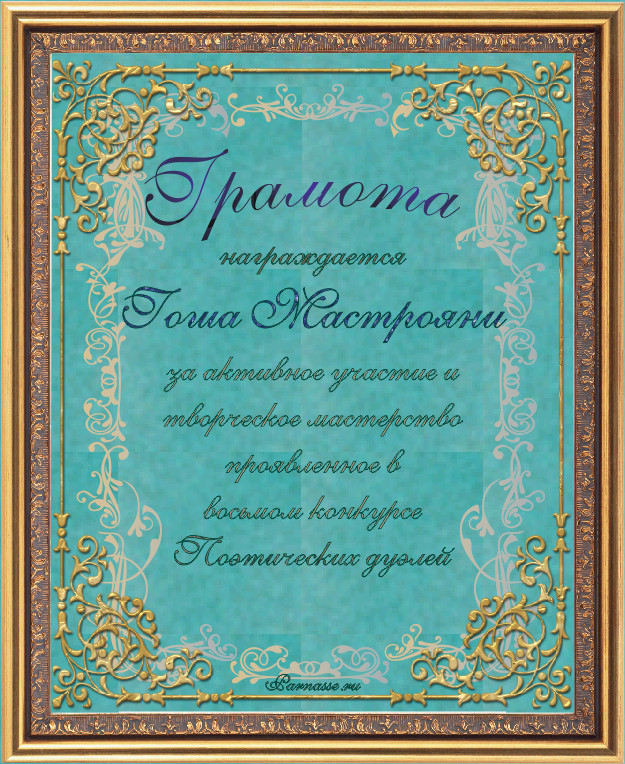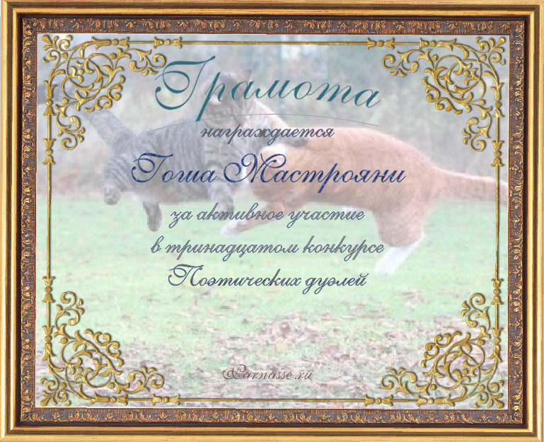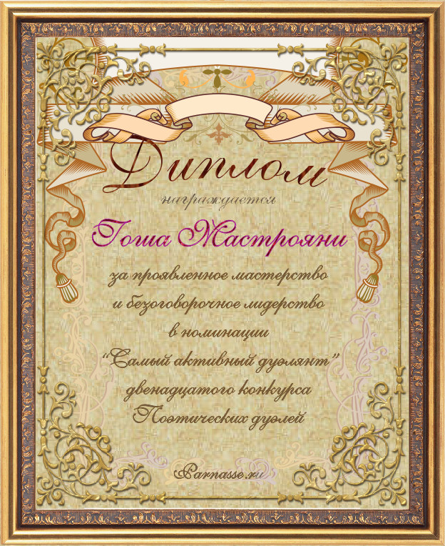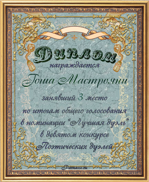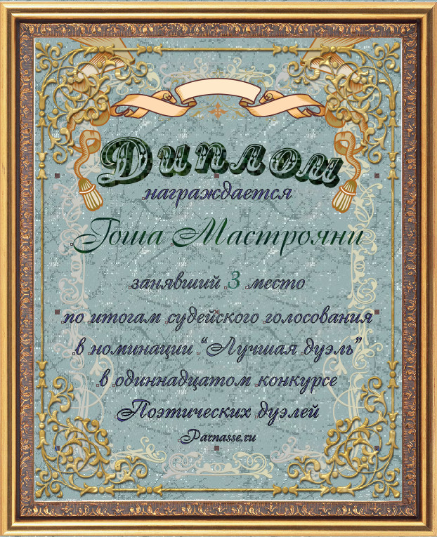 За 3-е место в номинации "ЛУЧШАЯ ДУЭЛЬ" 11го конкурса ПОЭТИЧЕСКИХ ДУЭЛЕЙ, по итогам судейского голосования, в паре с Лорой Вербицкой