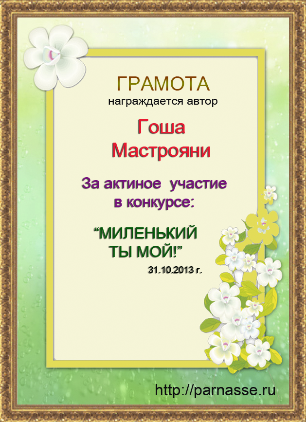 Победителю музыкально-литературного конкурса "Ах, Мама, Мамочка, родная!" Номинация "Стихи о Мамочке". Поздравляем! Счастья Вам, прекрасного настроения, вдохновения, успехов и всего замечательного. Спасибо за участие в конкурсе. С Уважением, Администрация.