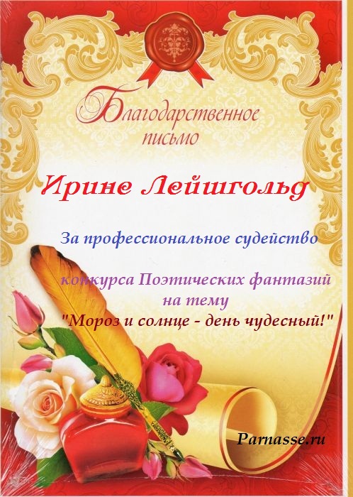 Уважаемая Ирина! Спасибо Вам большое за судейство 2-го тура II Поэтического Чемпионата Парнаса: Жанр – "Философская лирика". Тема – "Истоки жизни". "Трехстопный стихотворный метр". Добра Вам, благополучия, удачи, творческих успехов и всего самого наилучшего! С уважением и благодарностью, Администрация.