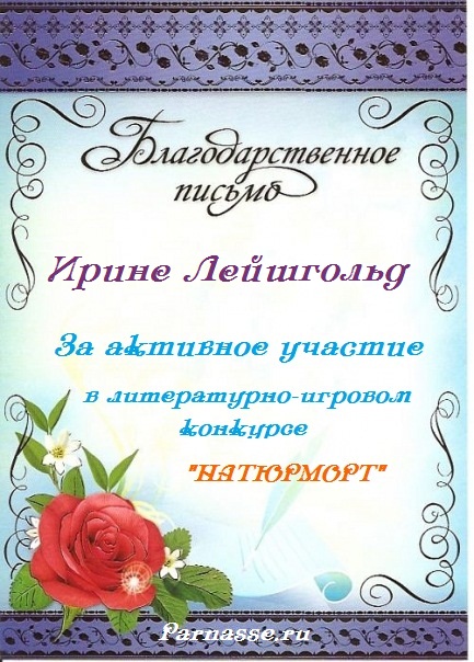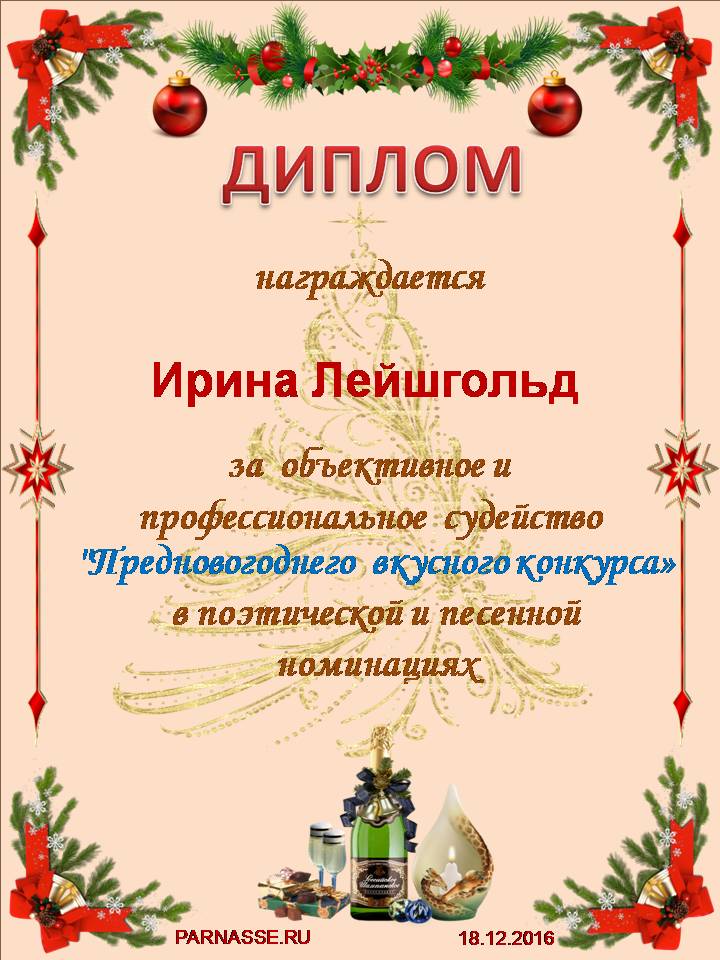 Уважаемая Ирина! Благодарим Вас за квалифицированное, оперативное, беспристрастное судейство поэтической номинации "Вкусные стихи - рецепт в стихах" в музыкально-литературном "Предновогоднем вкусном конкурсе". Спасибо за Вашу доброту и поддержку!