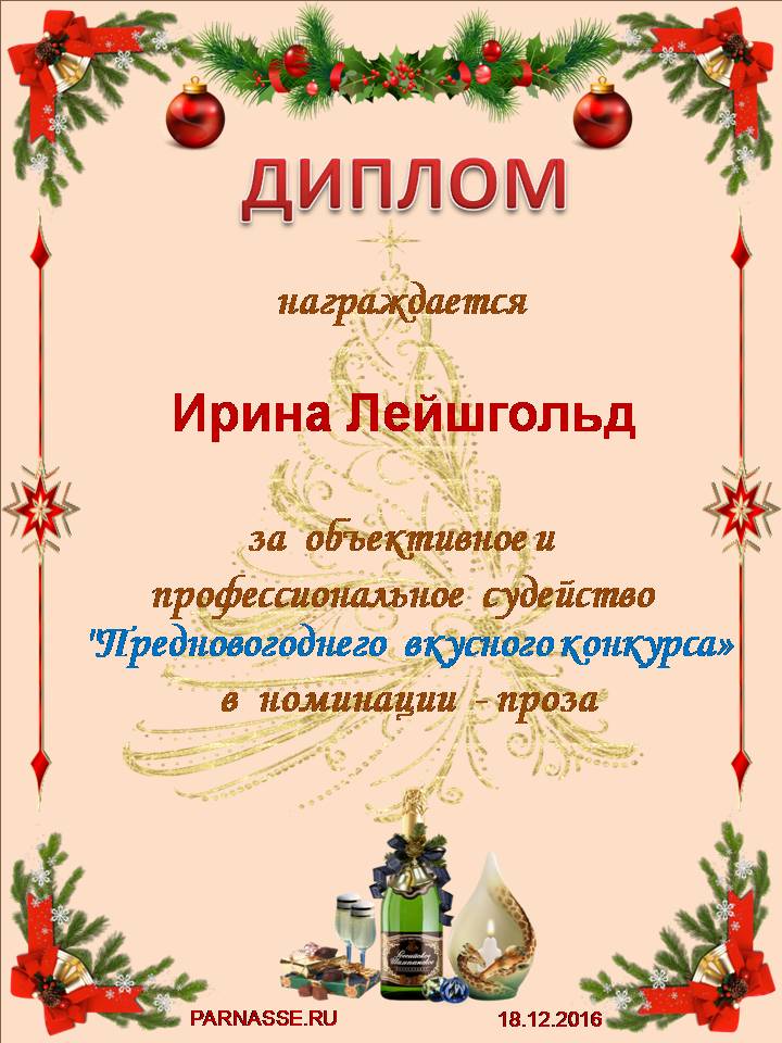 Уважаемая Ирина! Спасибо Вам большое за судейство конкурса "Предновогодний вкусный". Поздравляем с наступающим НОВЫМ 2017 ГОДОМ! Неиссякаемого ВДОХНОВЕНИЯ! С уважением и душевной теплотой, огромной благодарностью.