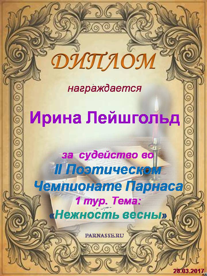 Диплом за судейство во II Поэтическом Чемпионате Парнаса. I тур . Тема "Нежность весны"