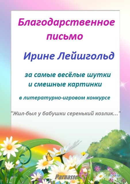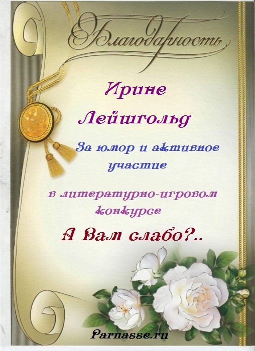Дорогая Ирина! Позвольте еще раз поблагодарить Вас за моральную и финансовую помощь "Парнасу"! Огромное душевное "СПАСИБО"! Низкий поклон!