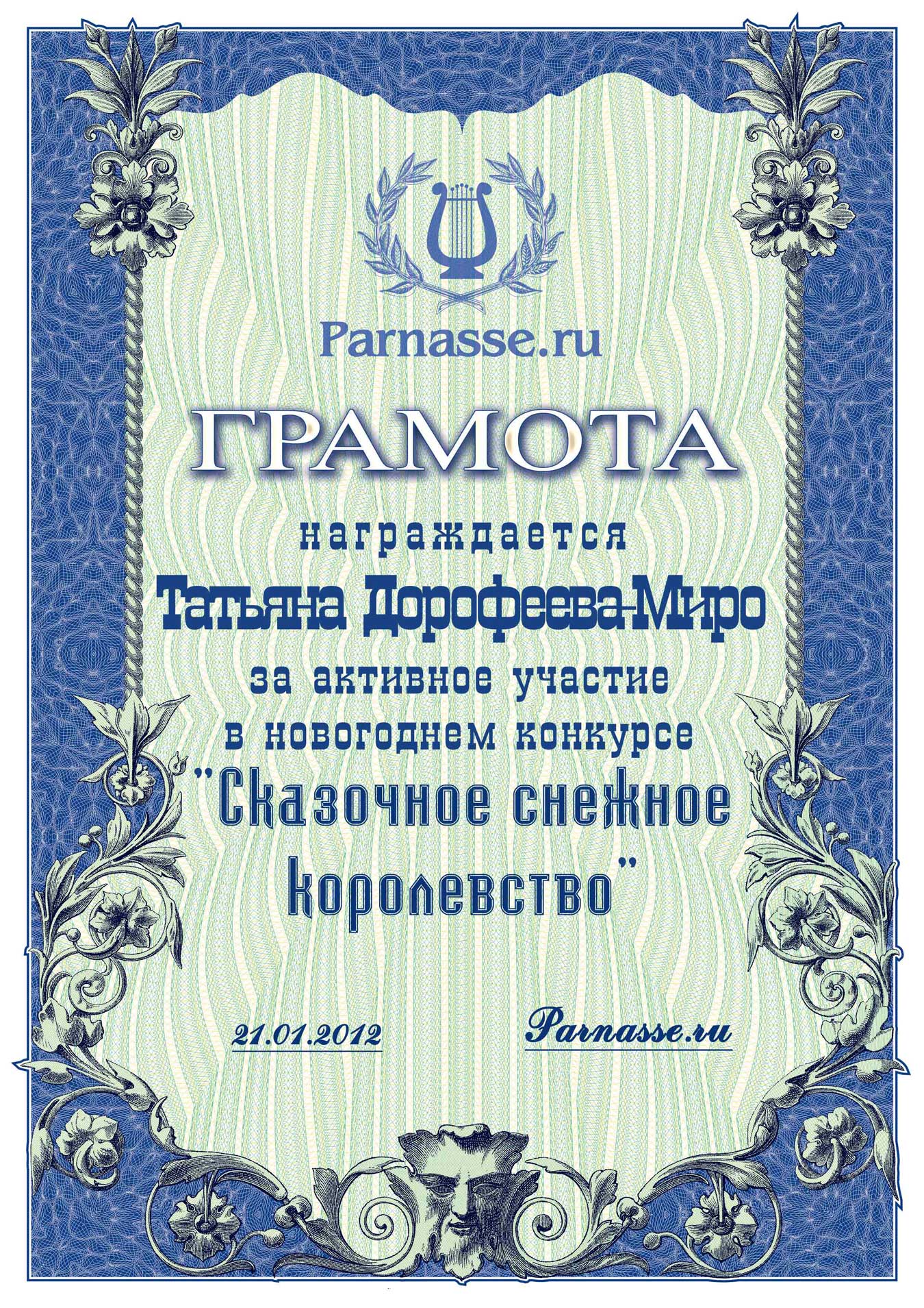 Грамота участника литературного конкурса "Сказочное снежное королевство"
