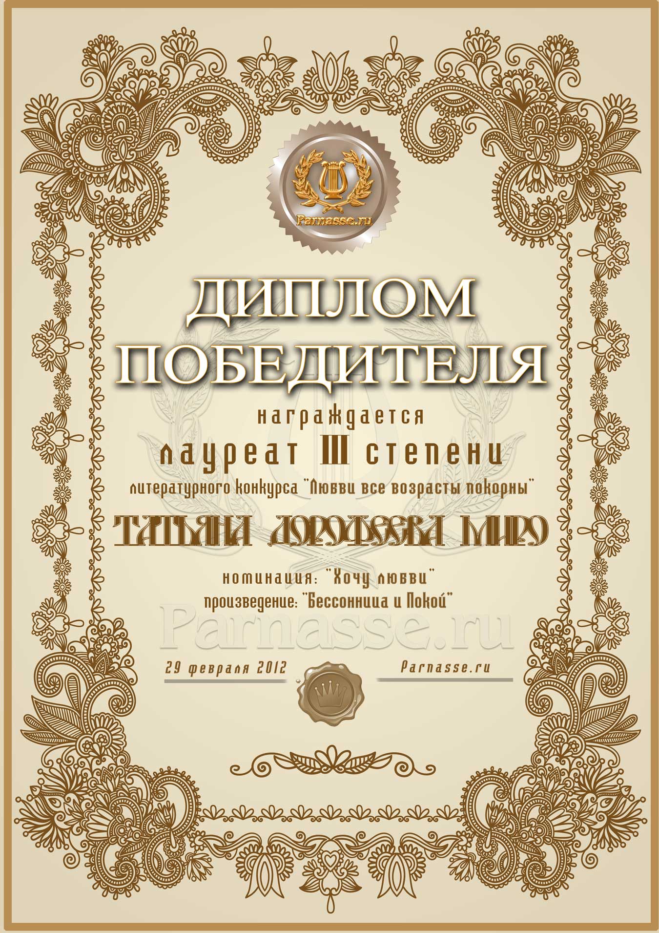 Диплом лауреата III степени лит.конкурса "Любви все возрасты покорны"