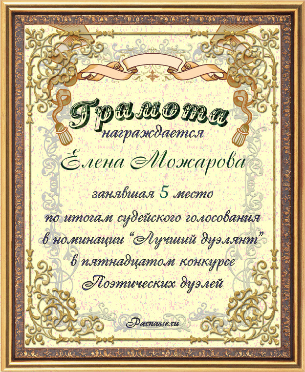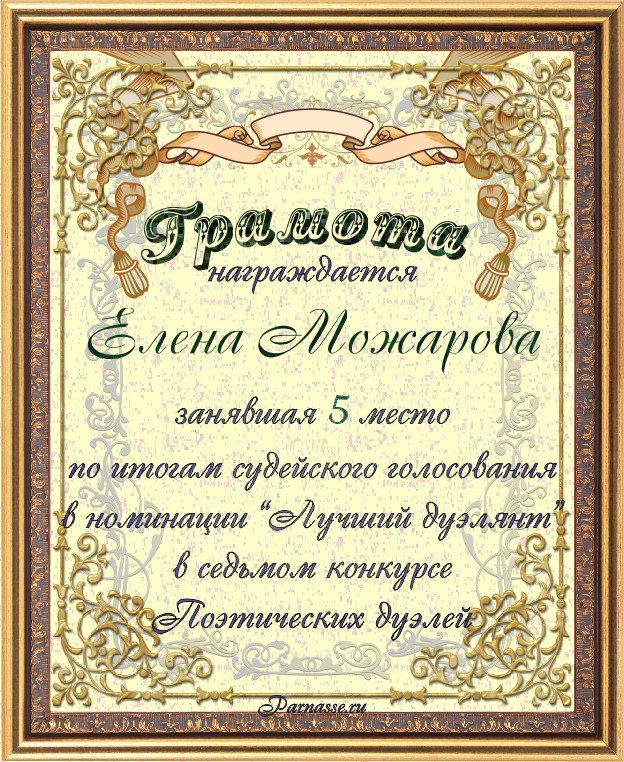 Грамота за 5-е место в номинации "Лучший дуэлянт" по итогам судейского голосования в седьмом конкурсе поэтических дуэлей