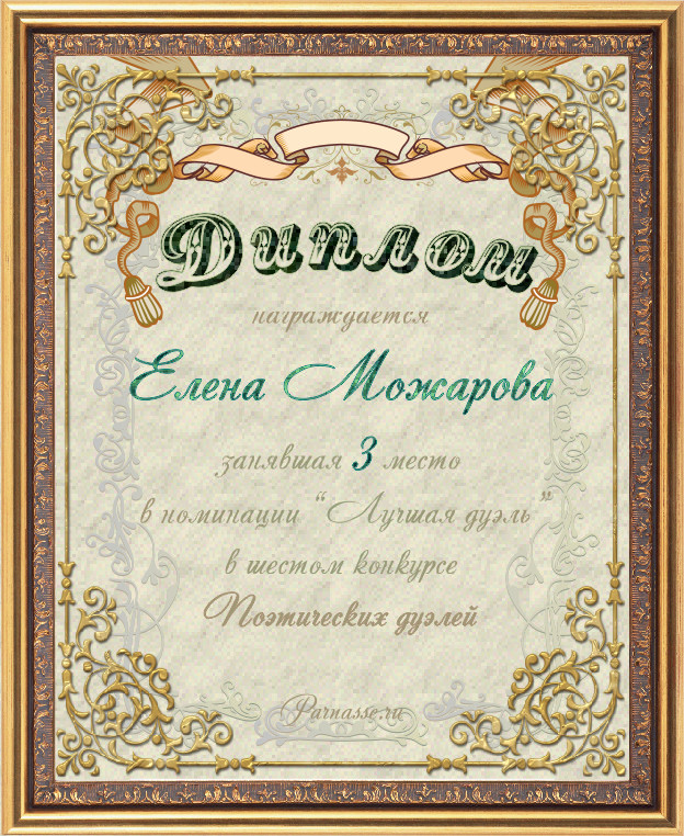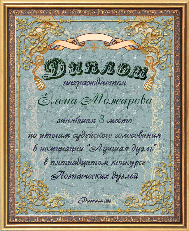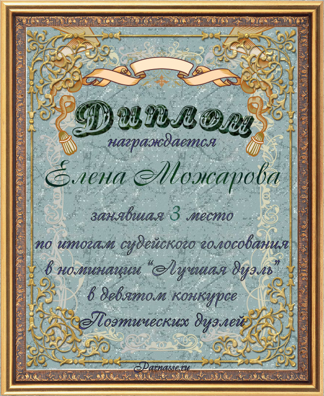 Диплом за 3-е место в номинации "Лучшая дуэль" по итогам судейского голосования в девятом конкурсе поэтических дуэлей(№ 8.1)