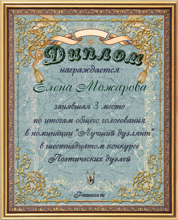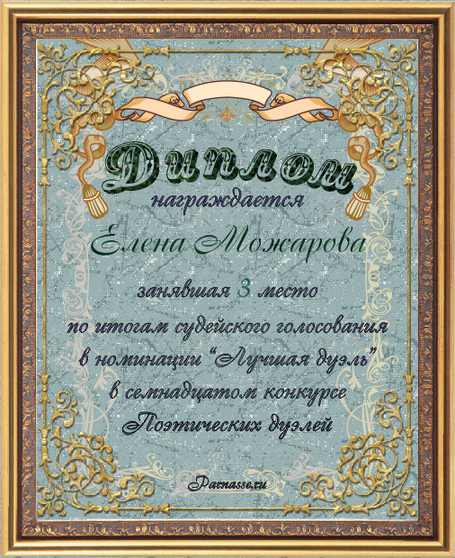 Диплом за 3-е место в номинации "Лучшая дуэль" по итогам общего голосования в девятом конкурсе поэтических дуэлей(№ 14.1)
