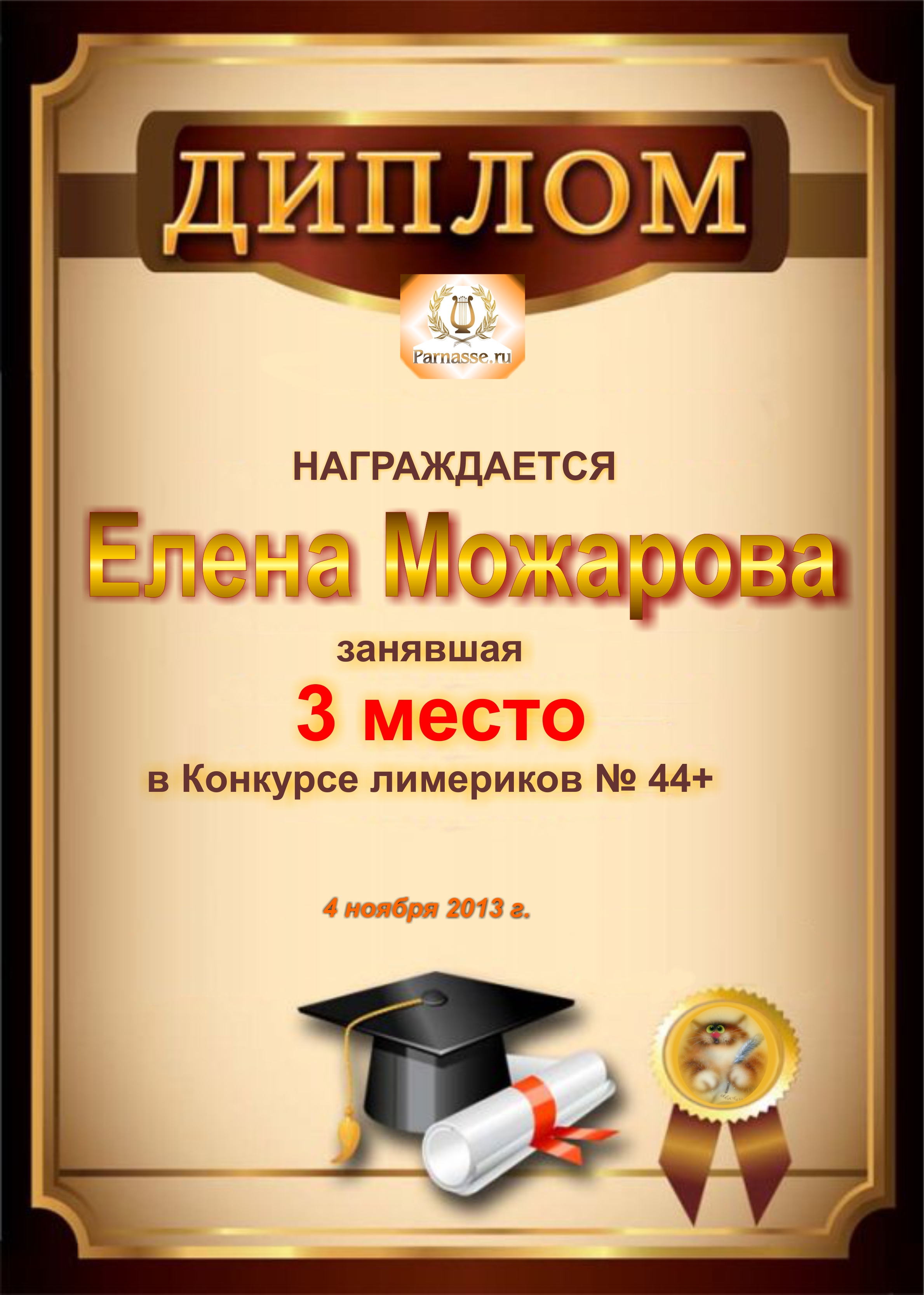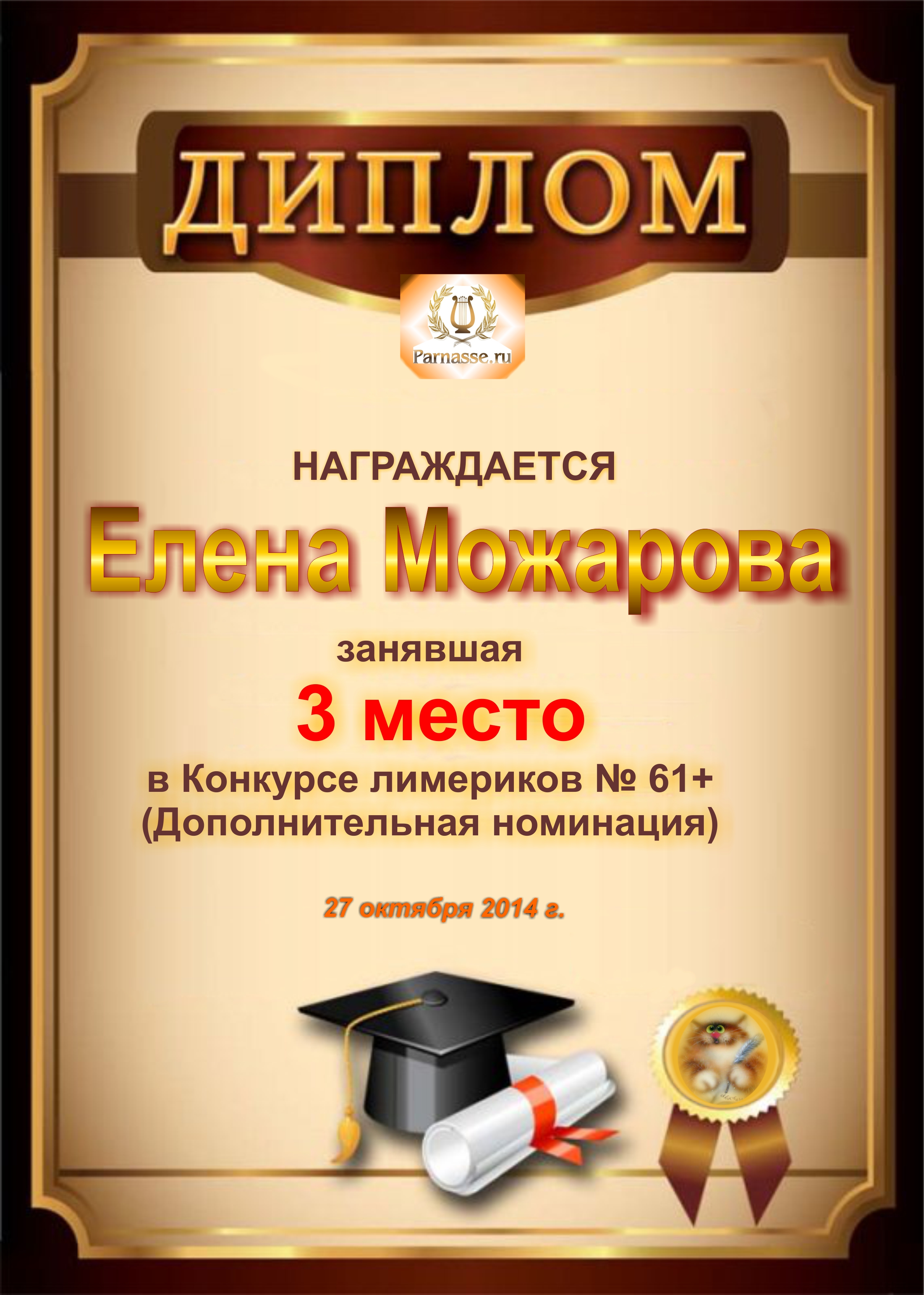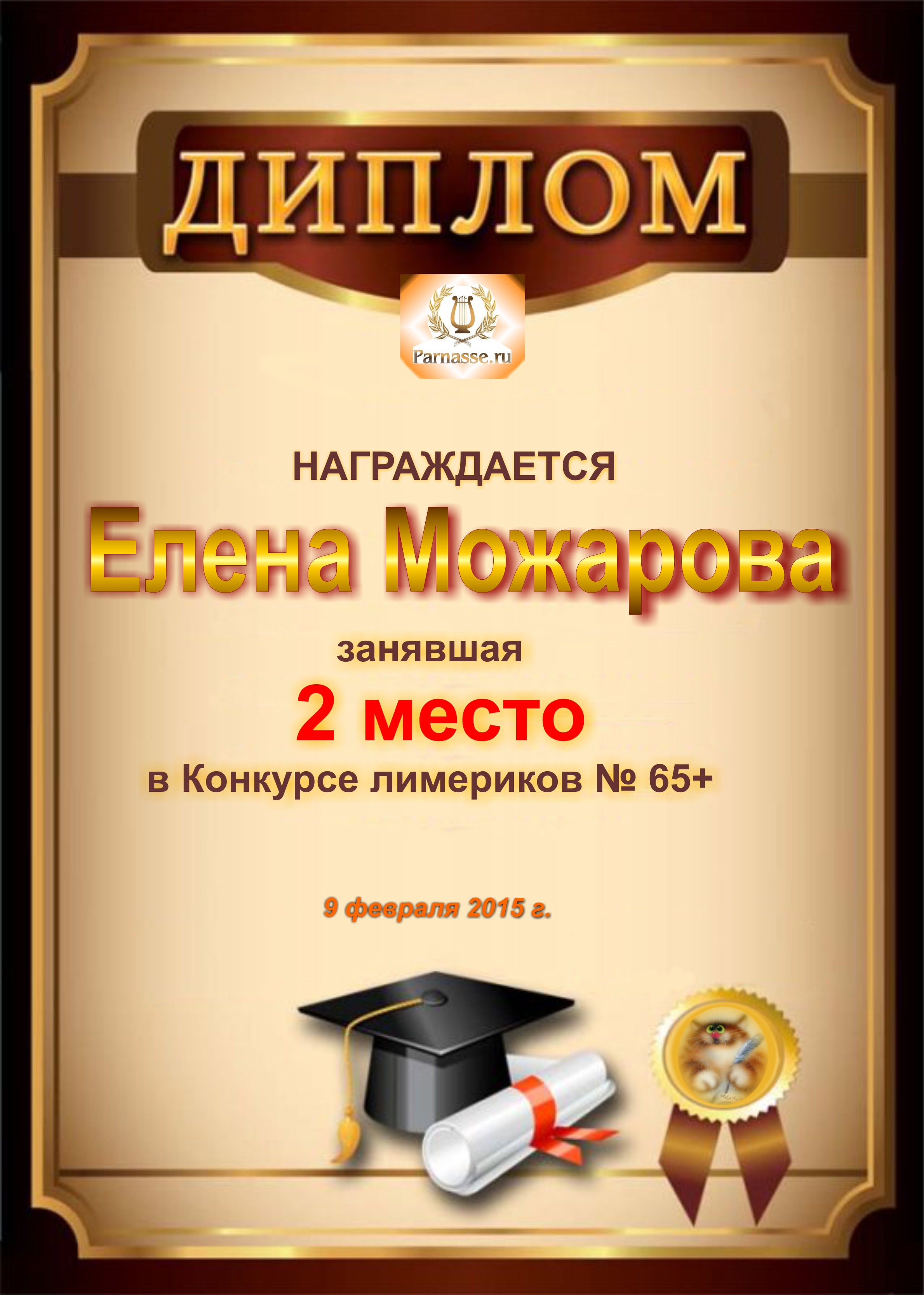 Диплом за победу и 3 место в дополнительной номинации конкурса лимериков № 50+ (2.03.2014 г.)