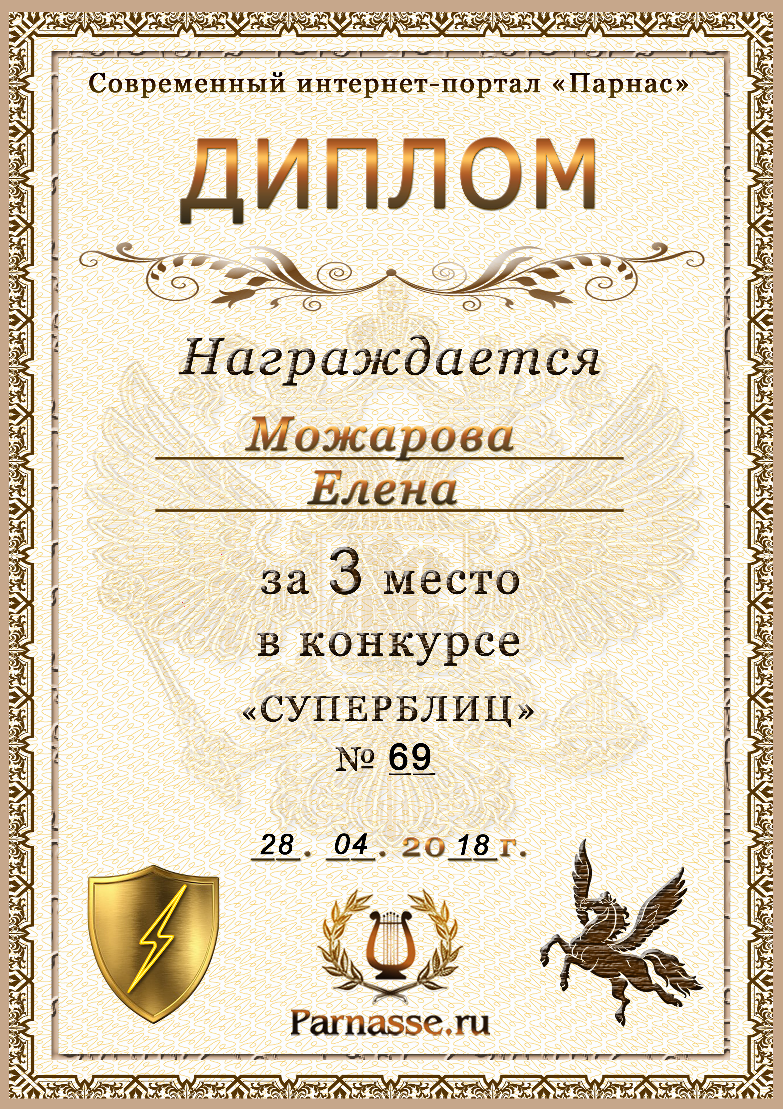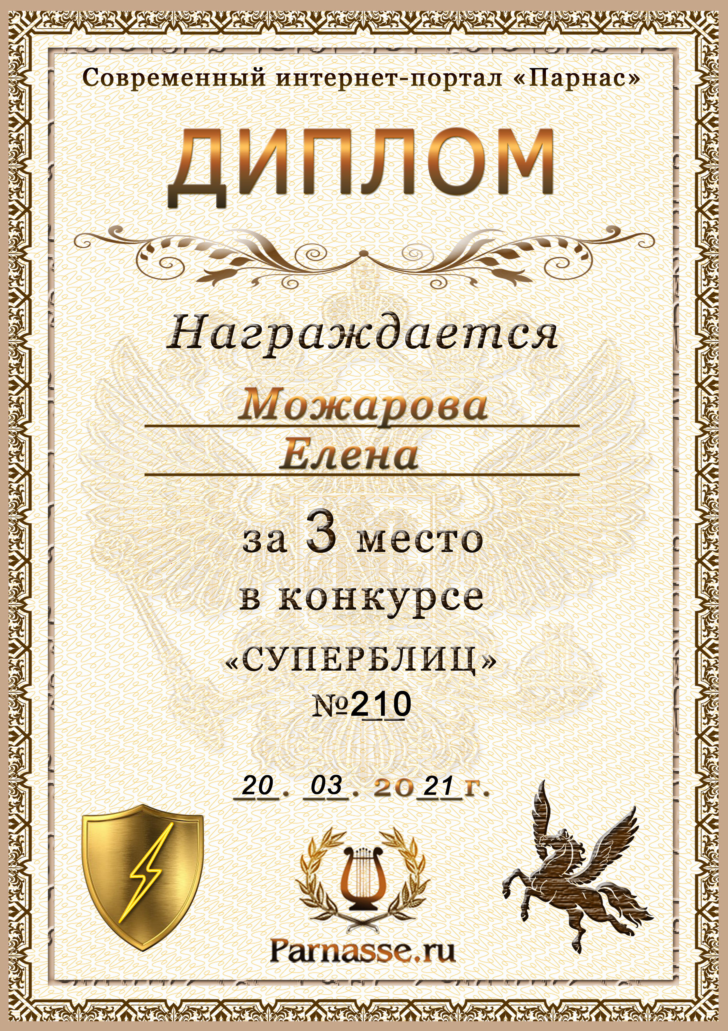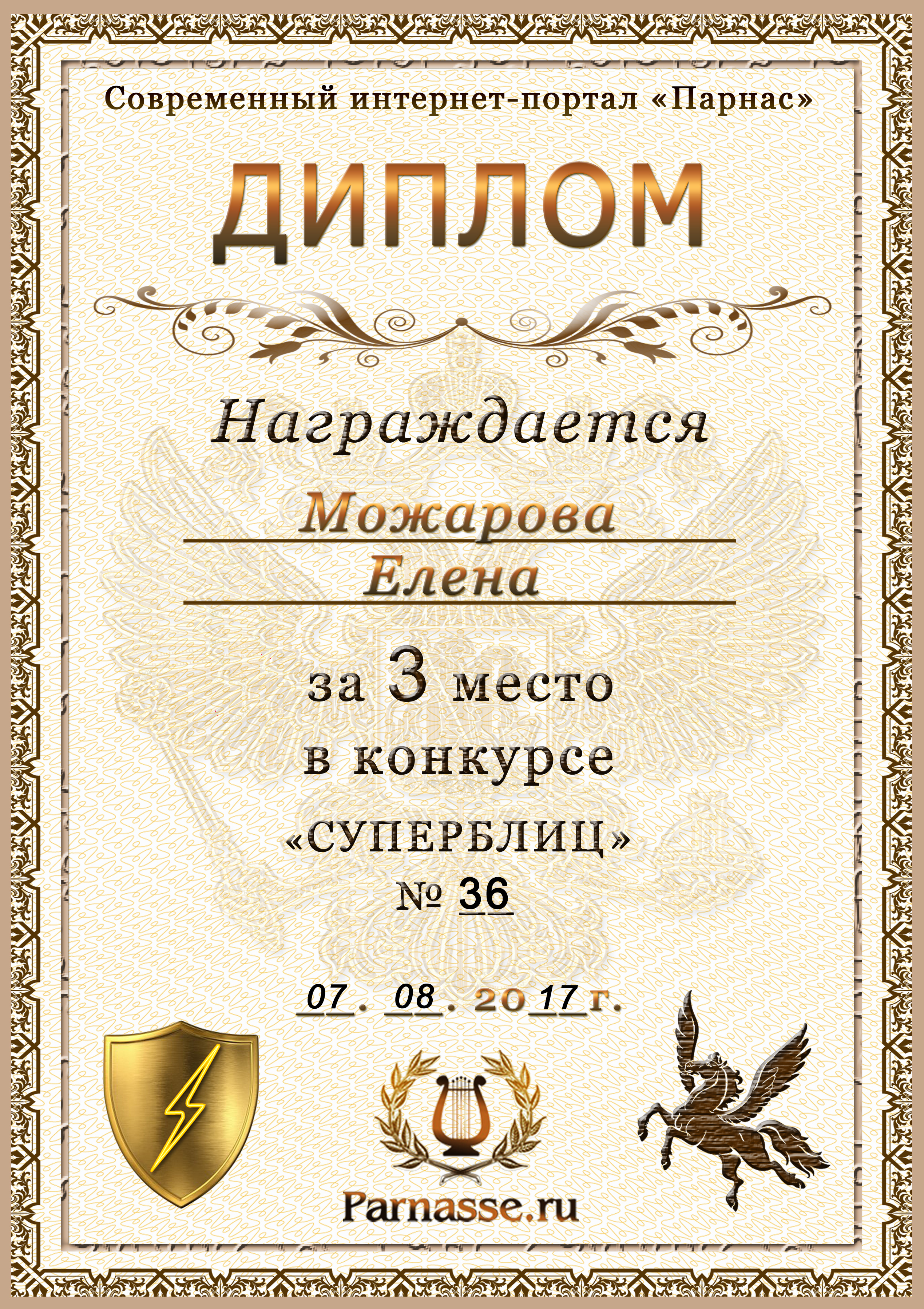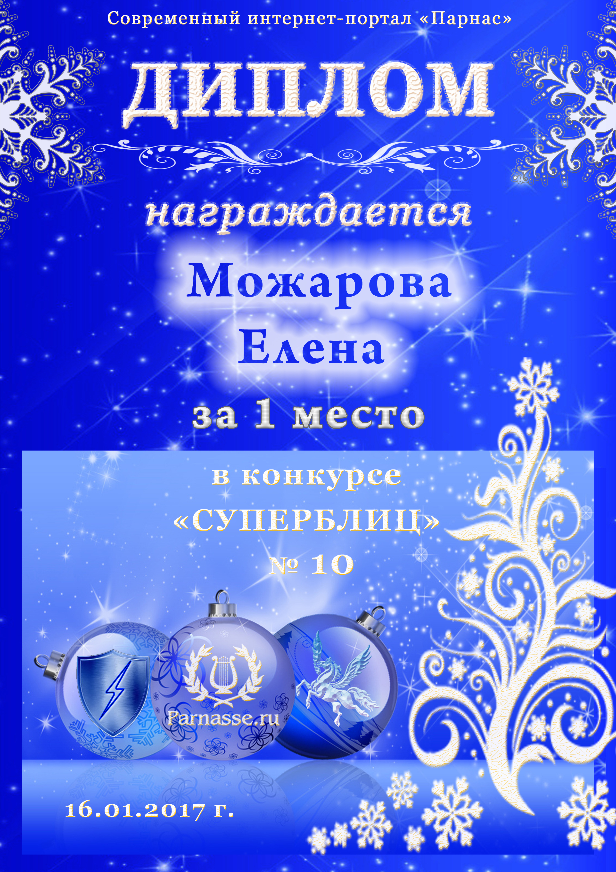 Диплом Победителя за 1 место в праздничном конкурсе "Поздравим Парнас с трёхлетием вместе!"