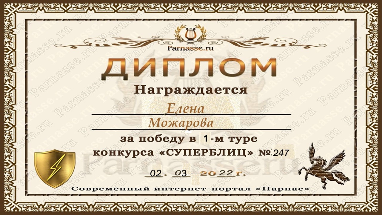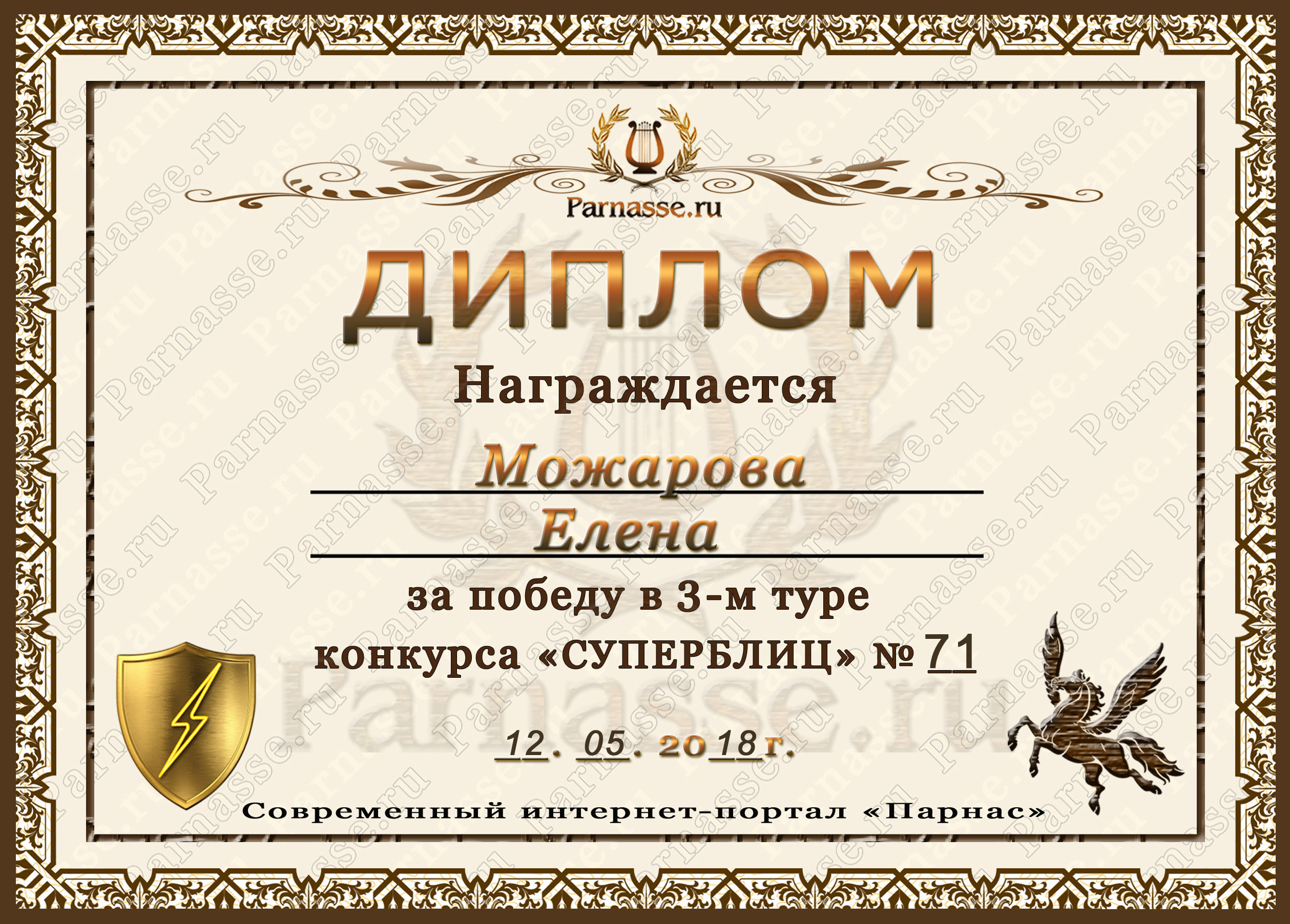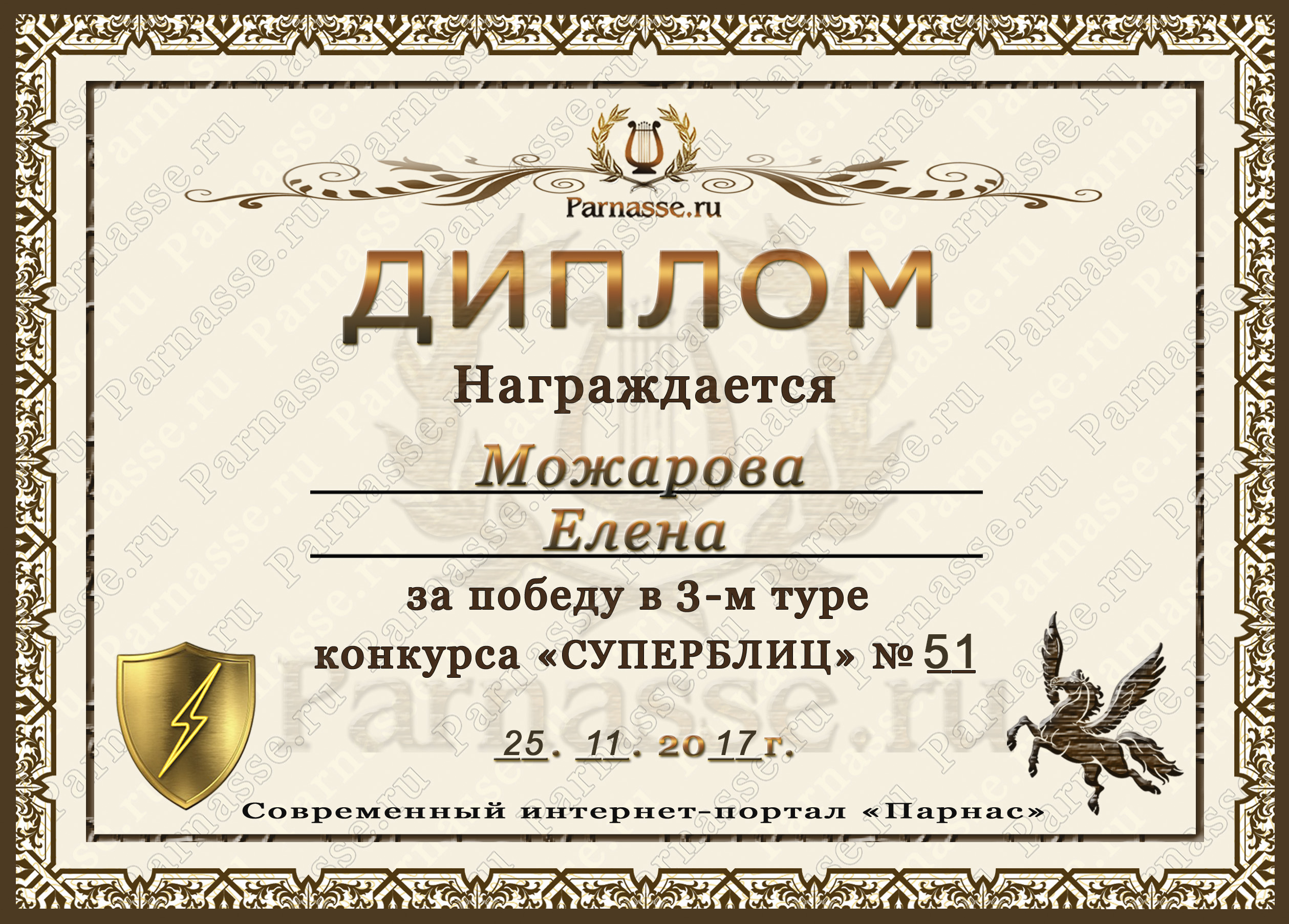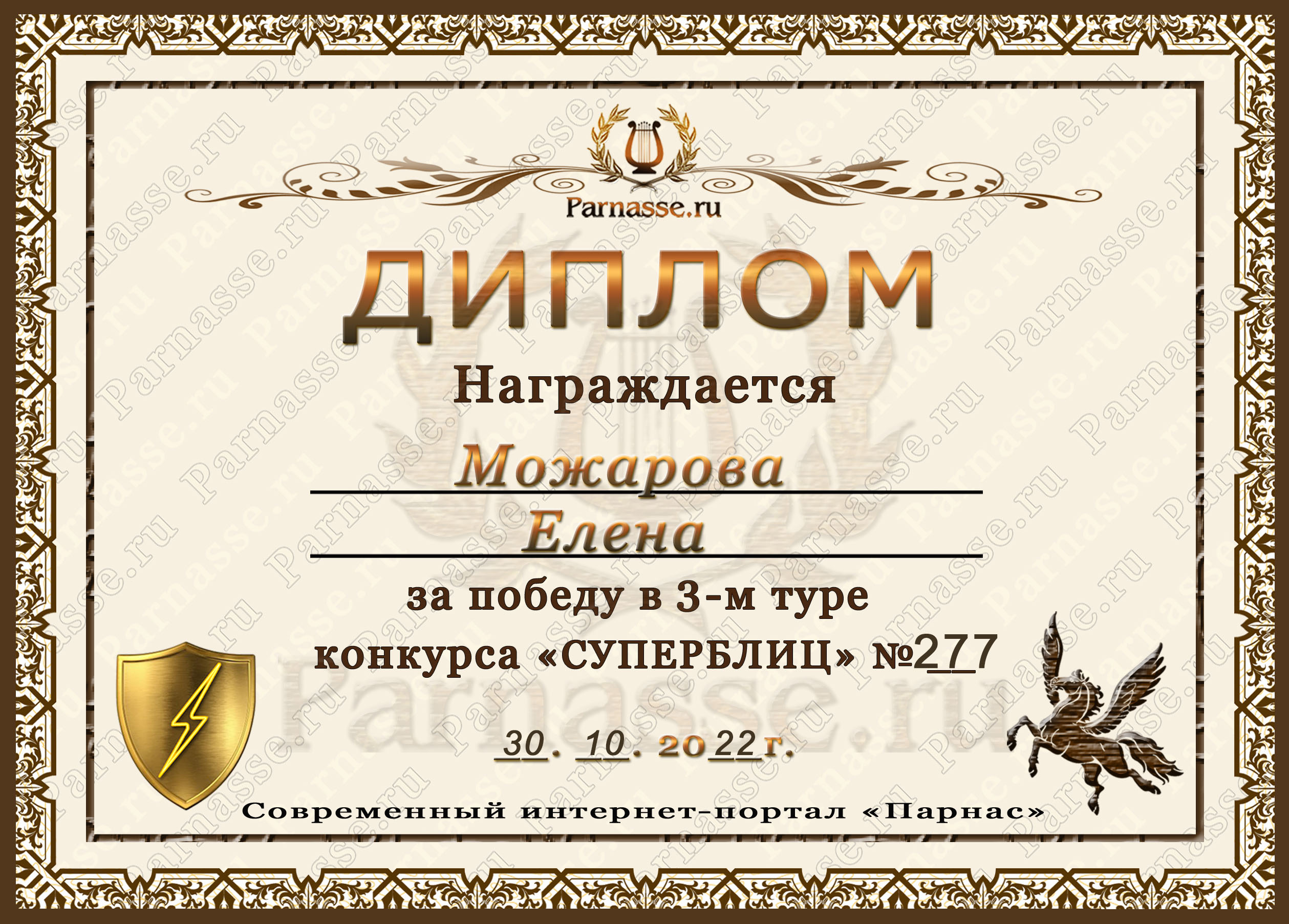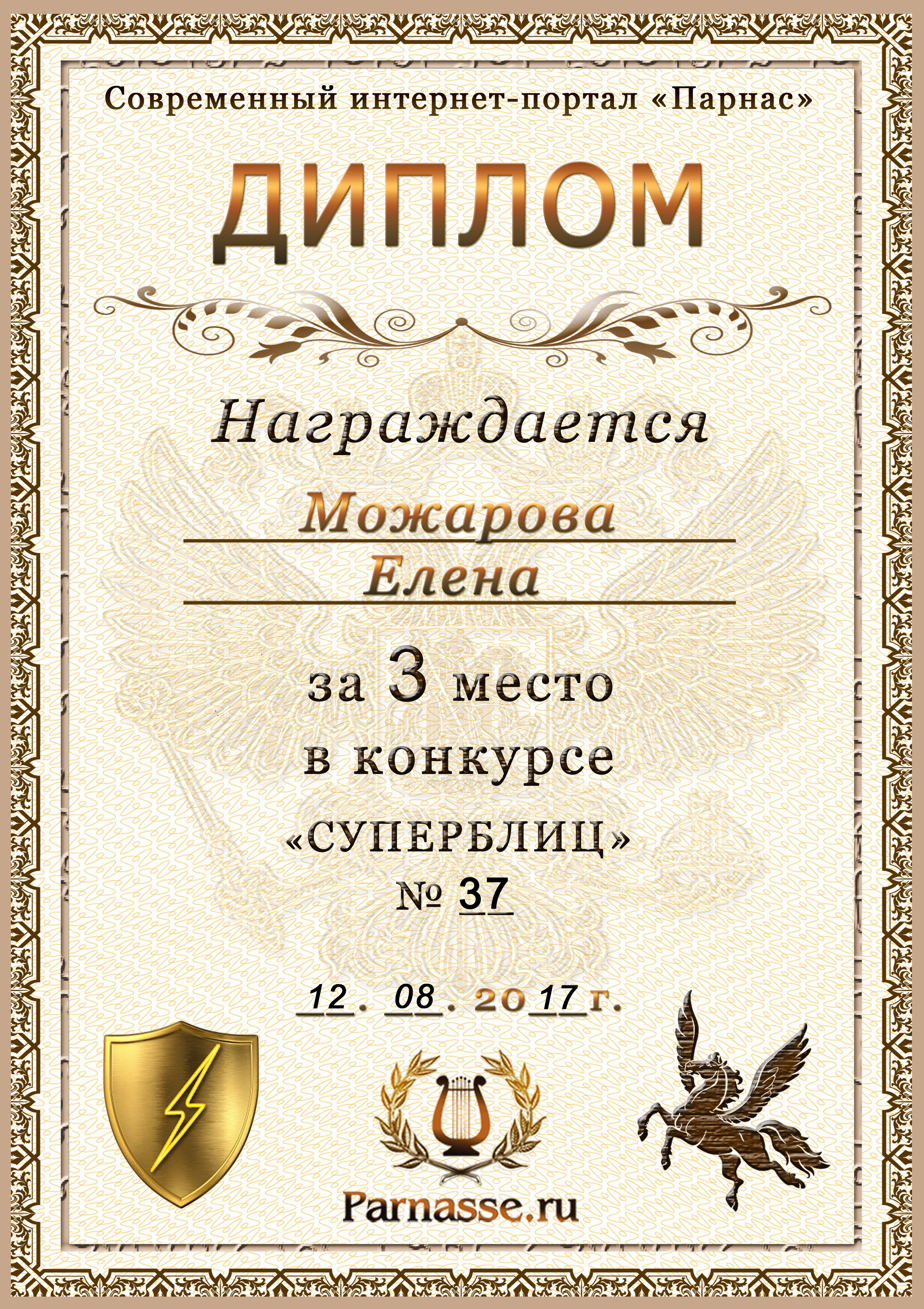 Диплом Победителя за 1 место в праздничном конкурсе "Поздравим Парнас с трёхлетием вместе!"