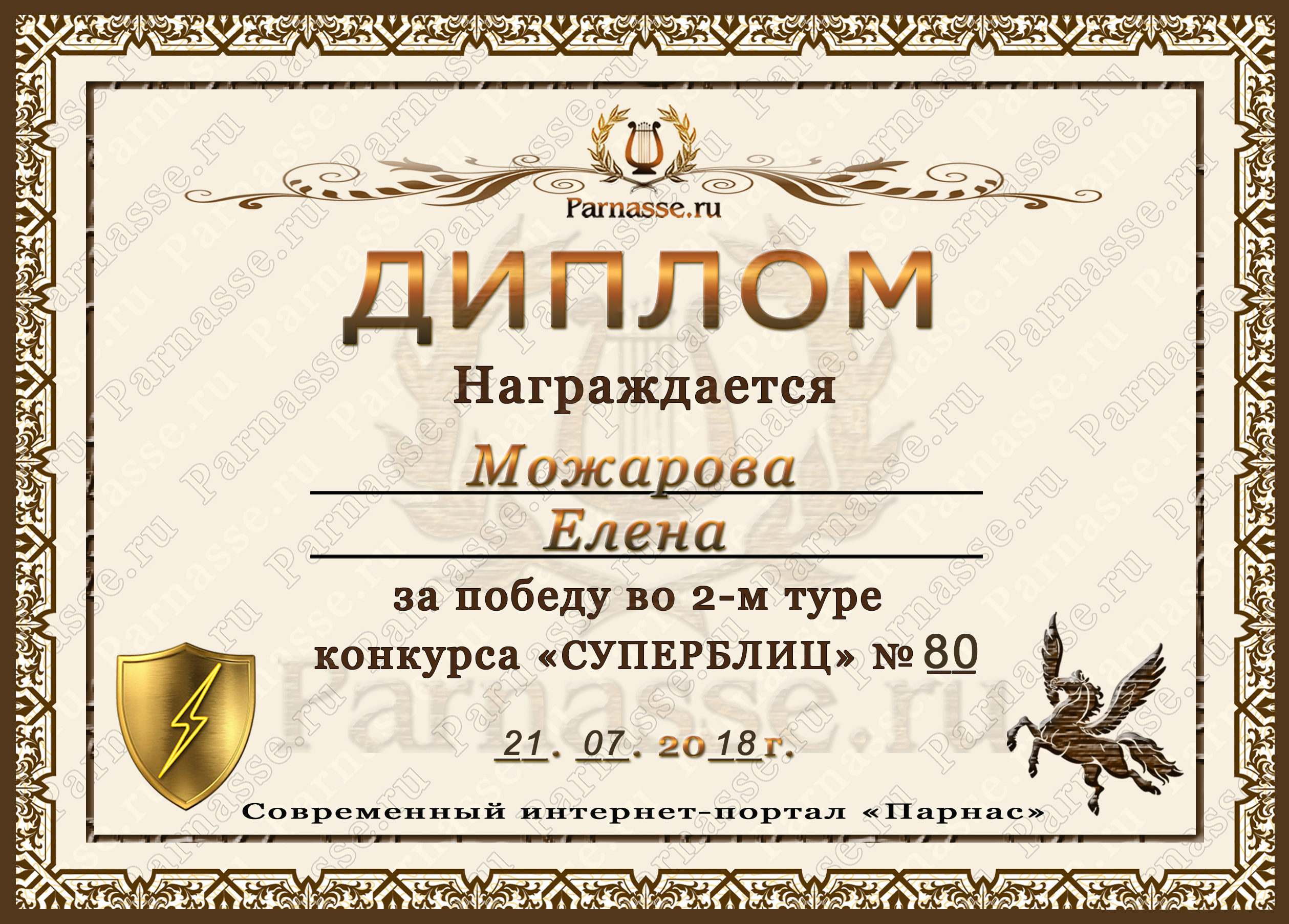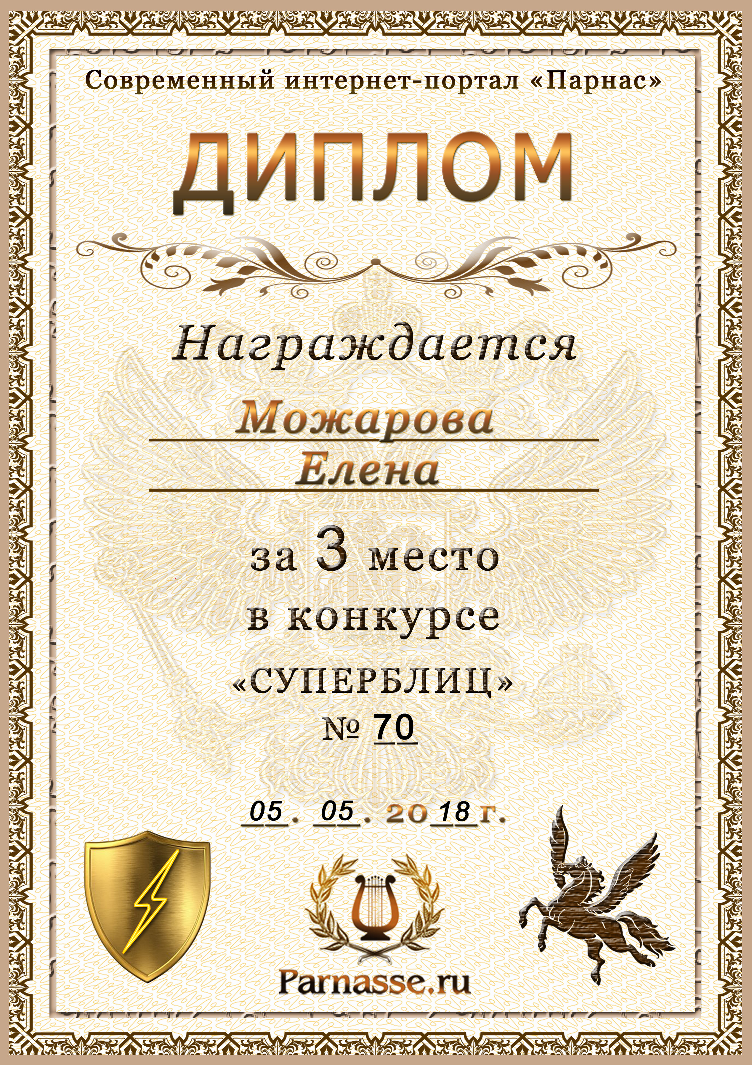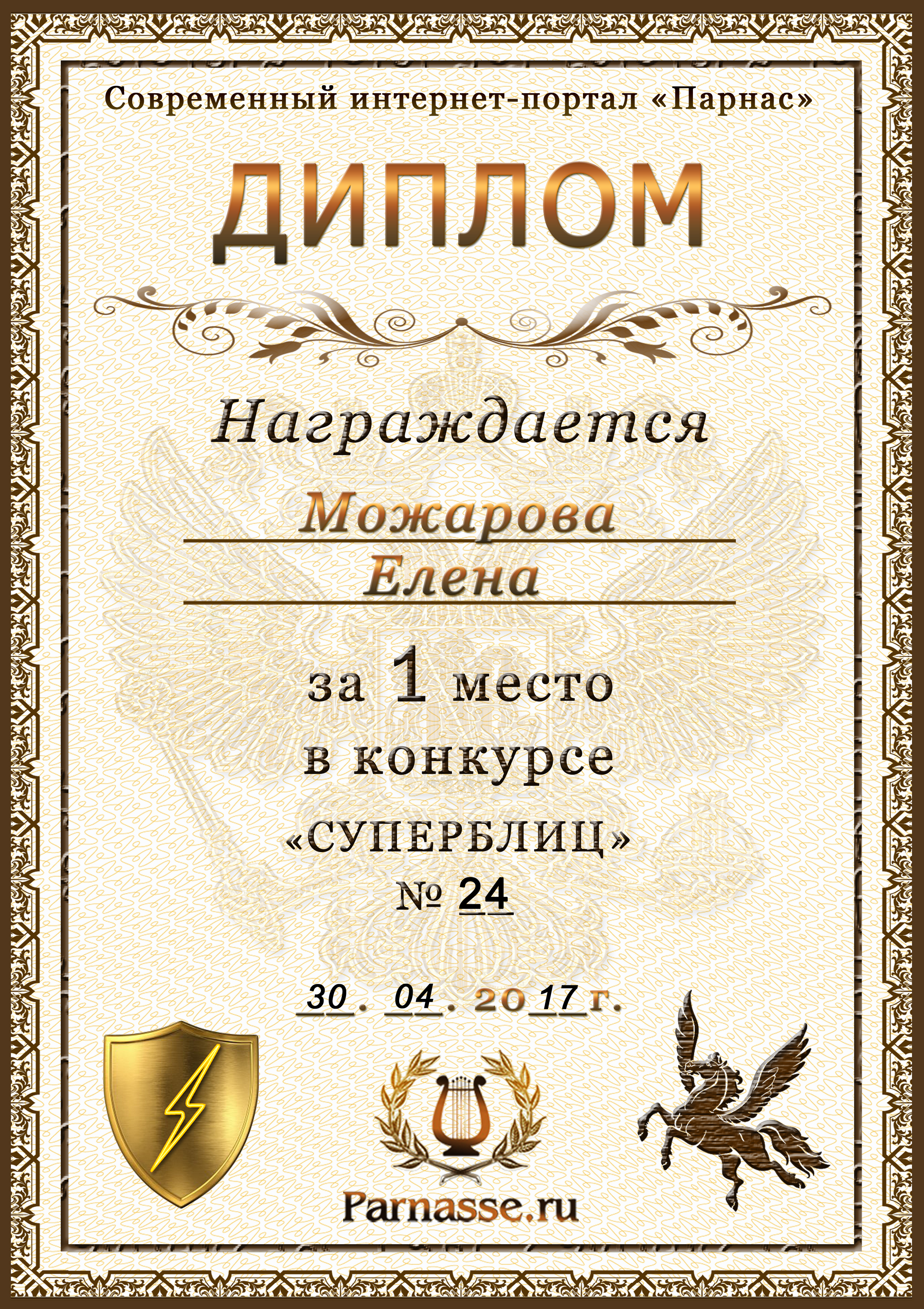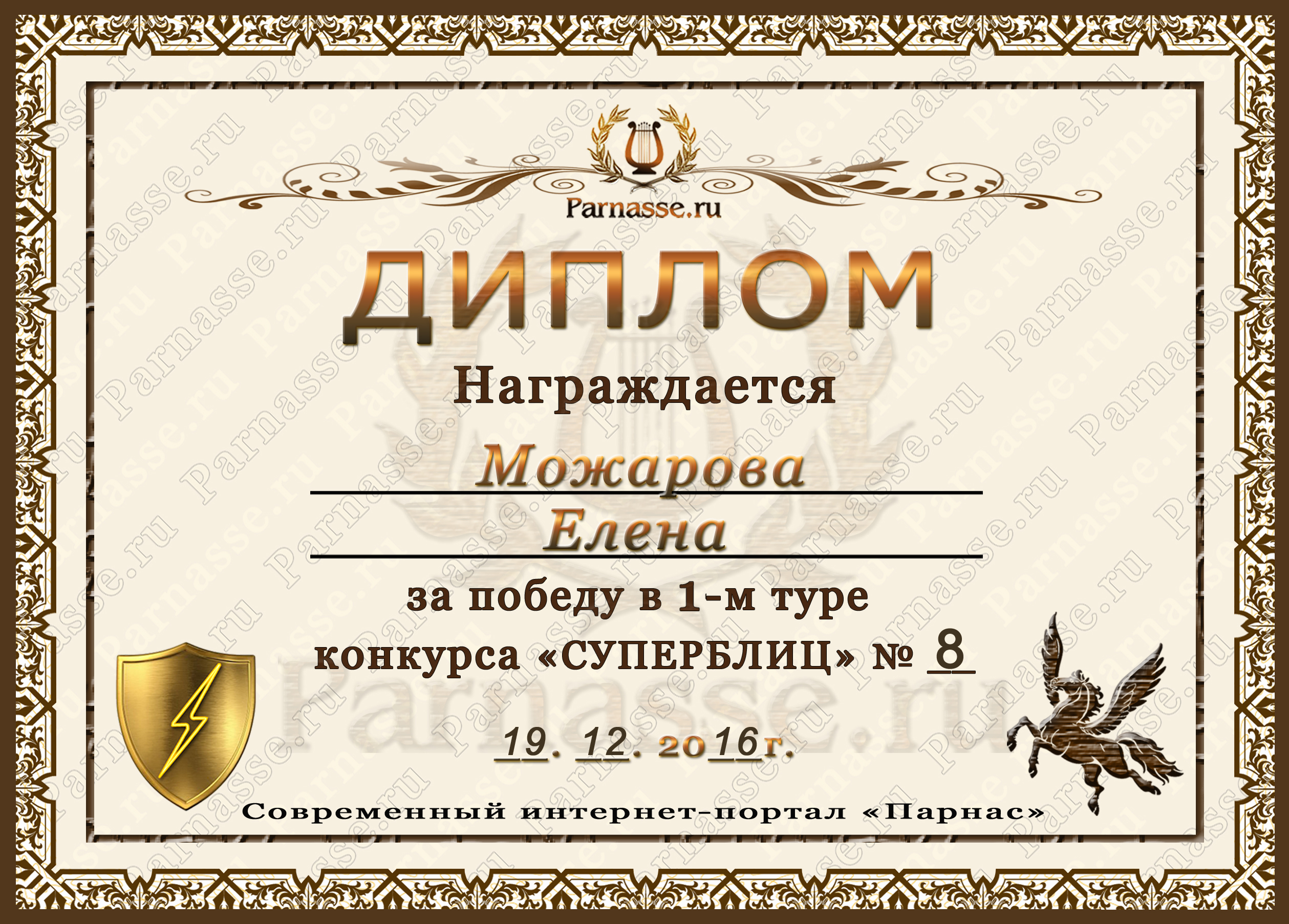 Диплом Победителя за 1 место в праздничном конкурсе "Поздравим Парнас с трёхлетием вместе!"
