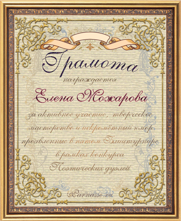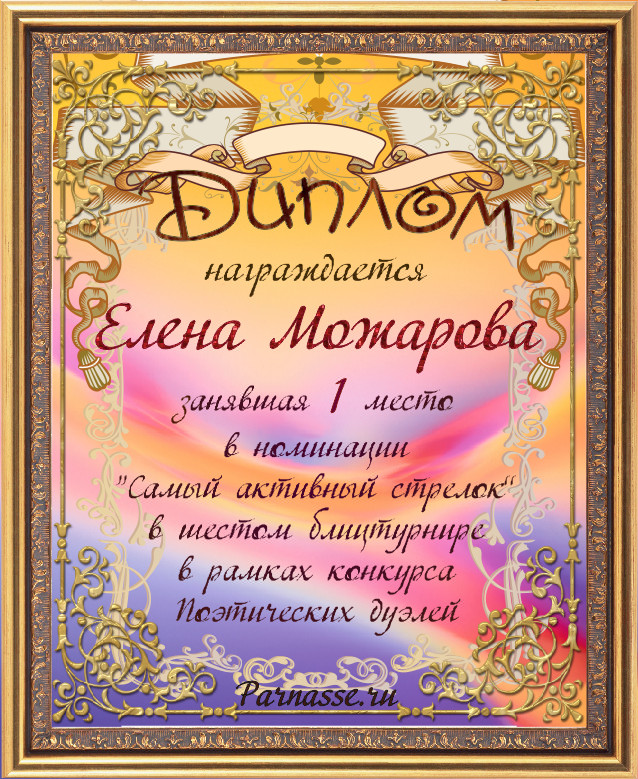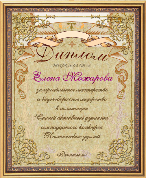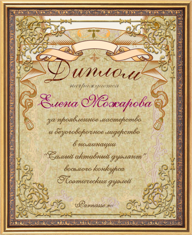 Диплом присуждён в номинации "Самый активный дуэлянт" восьмого конкурса поэтических дуэлей