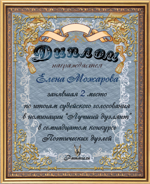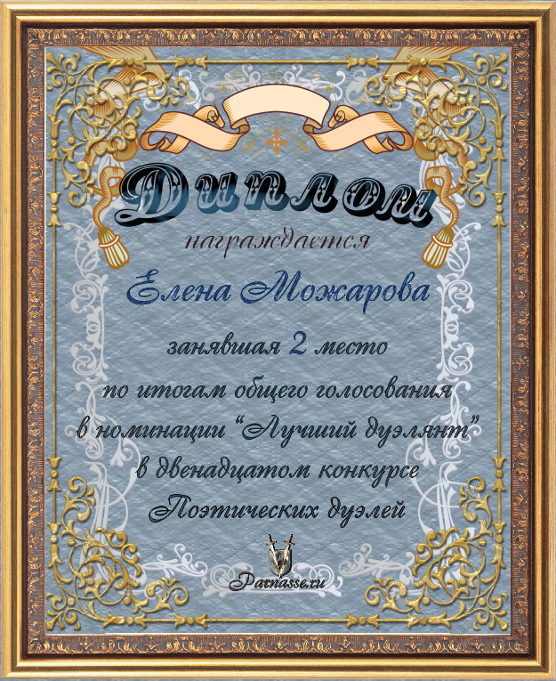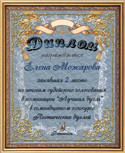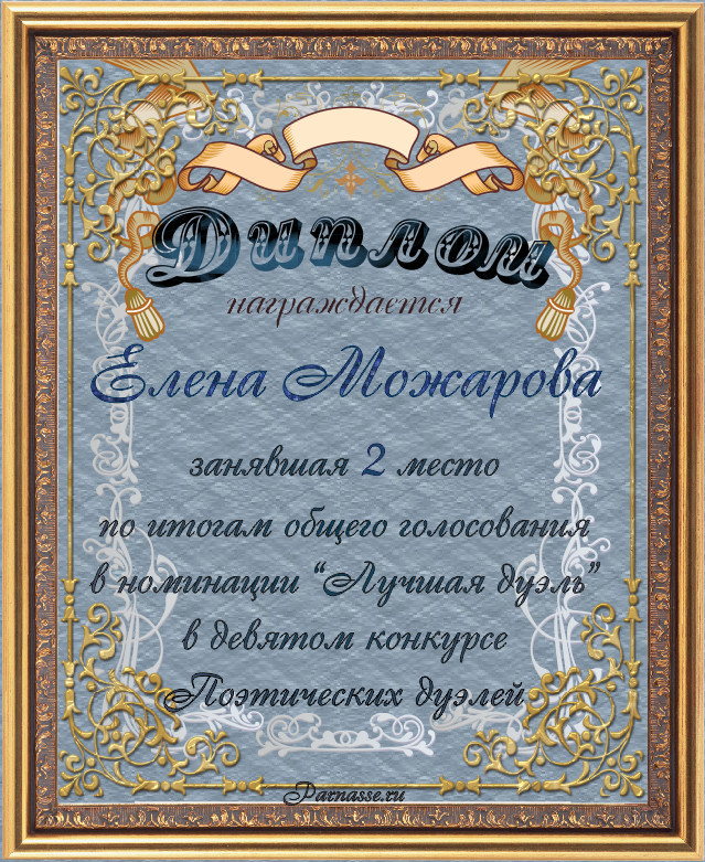 Диплом за 2-е место в номинации "Лучшая дуэль" по итогам общего голосования в девятом конкурсе поэтических дуэлей(№ 10.1)