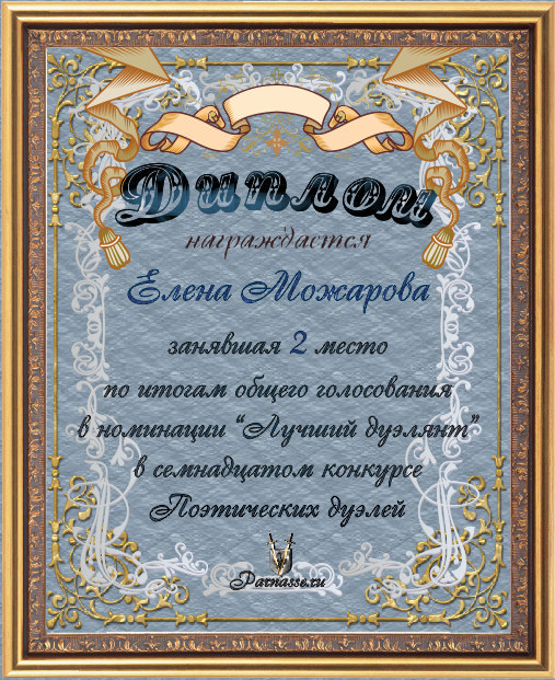 Диплом за 2-е место в номинации "ЛУЧШИЙ ДУЭЛЯНТ" по итогам общего голосования в 12М конкурсе поэтических дуэлей