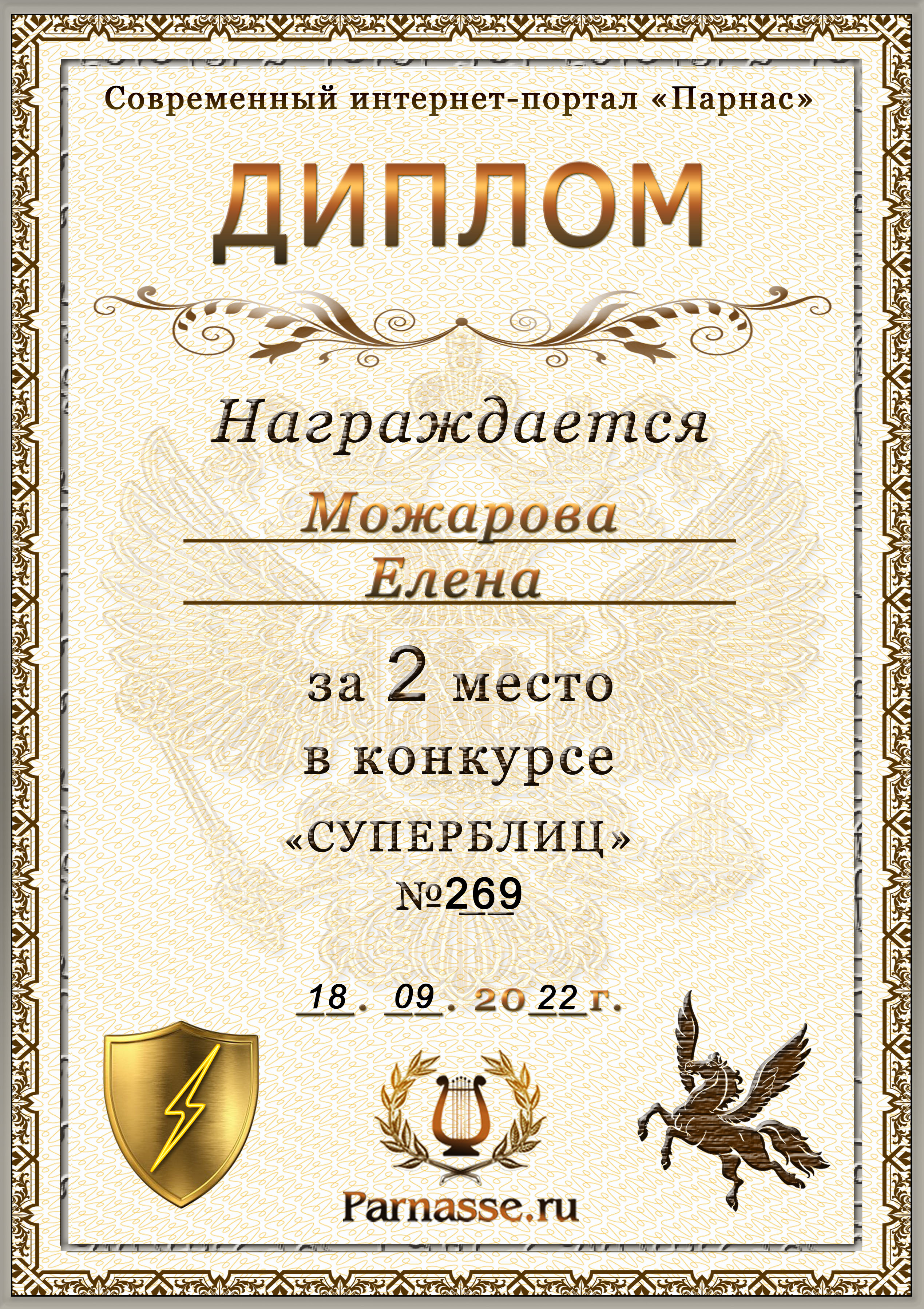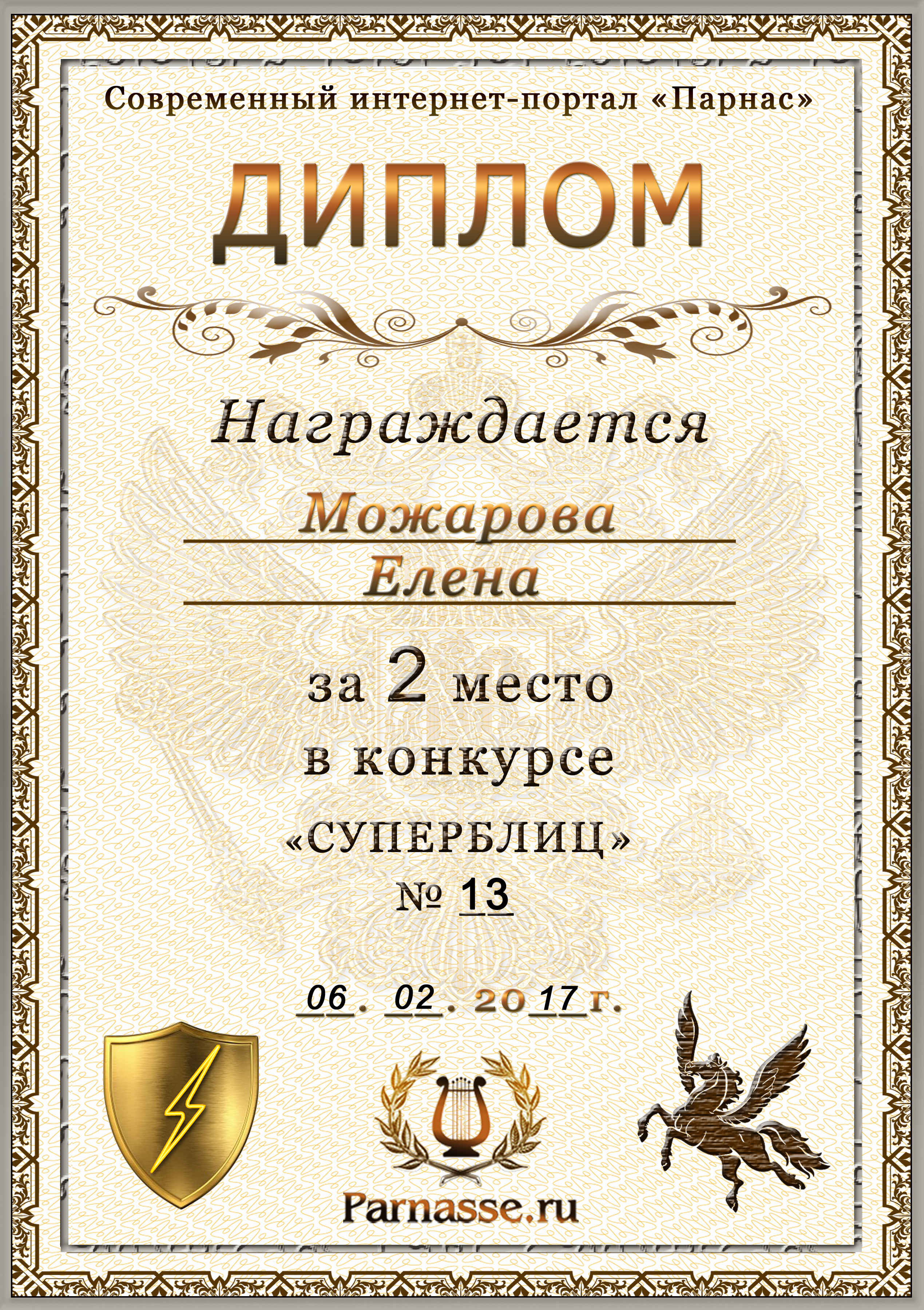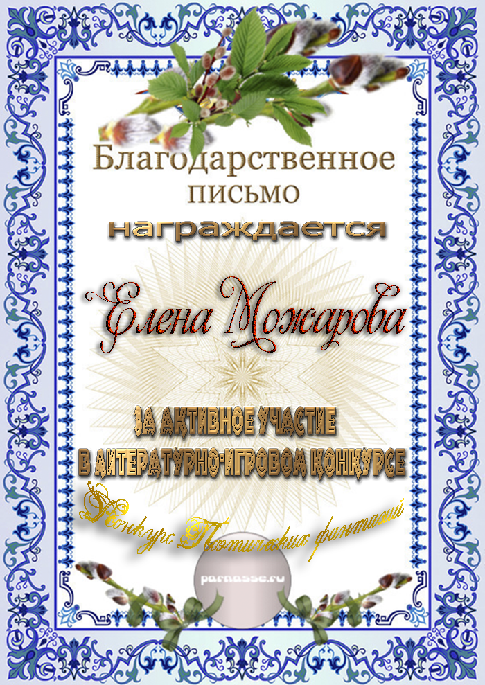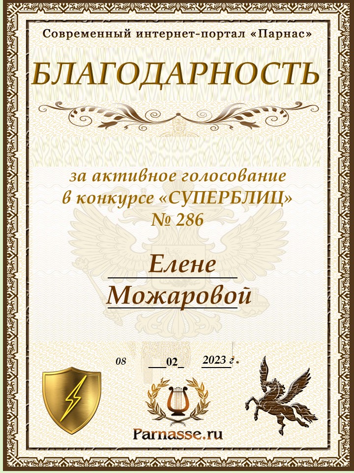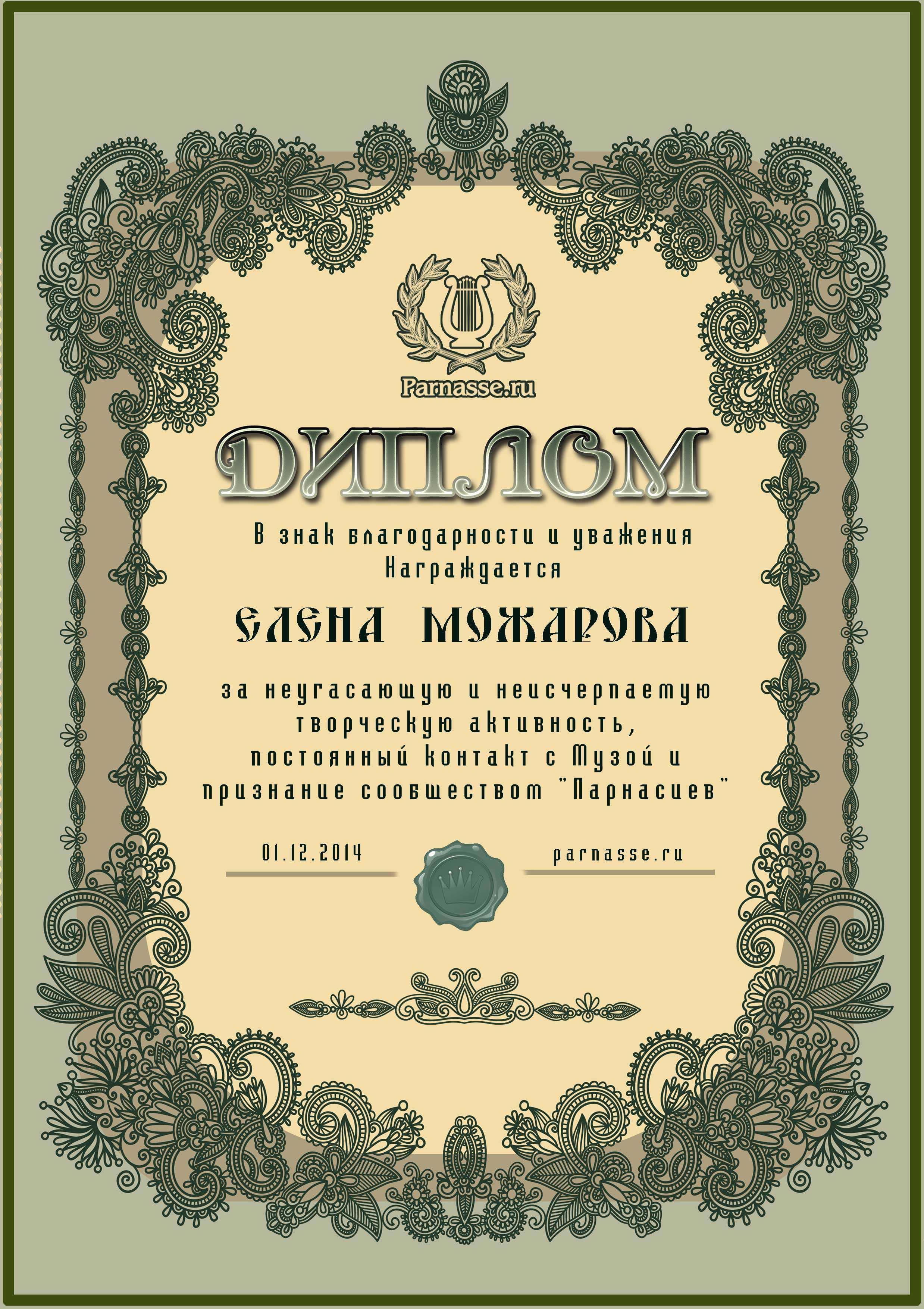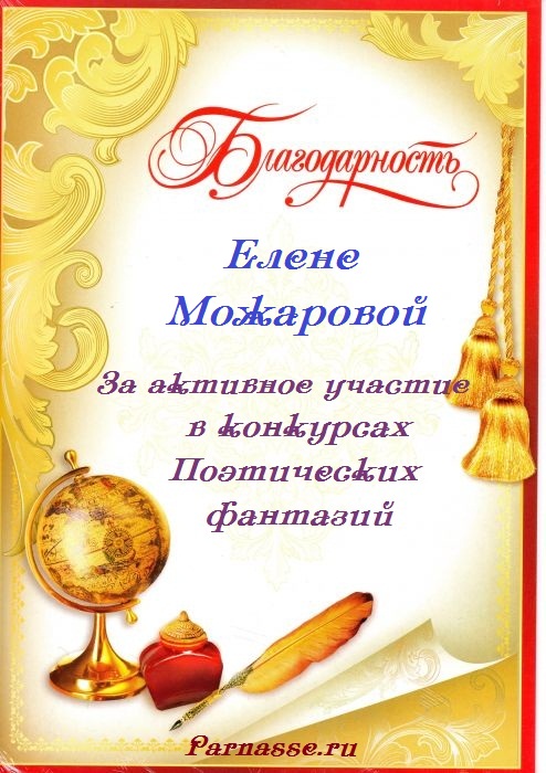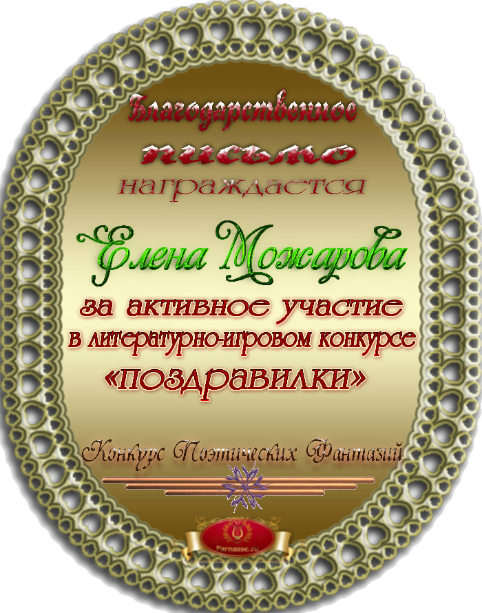 За неугасающую и неисчерпаемую творческую активность, постоянный контакт с Музой и признание сообществом "Парнасцев".От всей души желаем Вам, Елена, здоровья, любви, успехов, благополучия, удачи и творческого вдохновения!