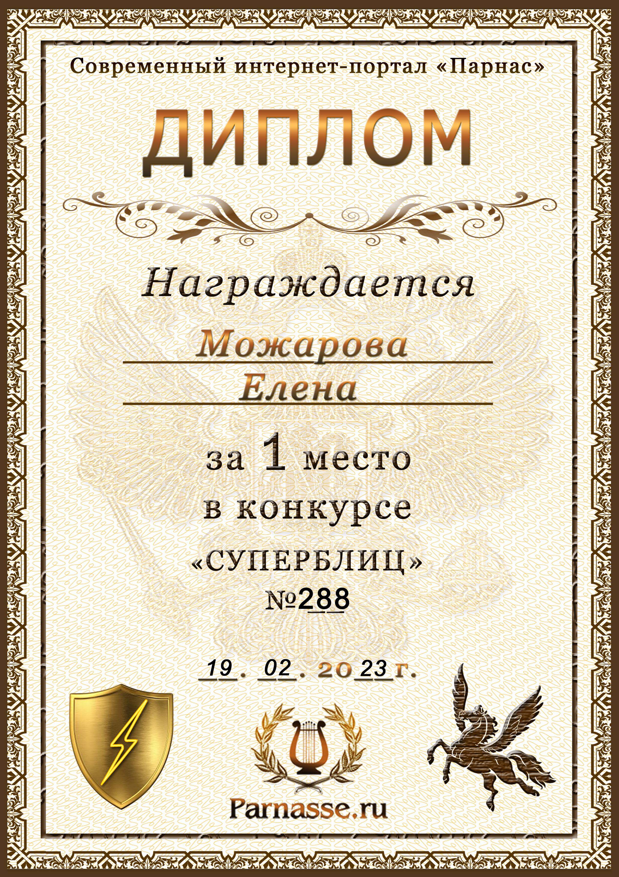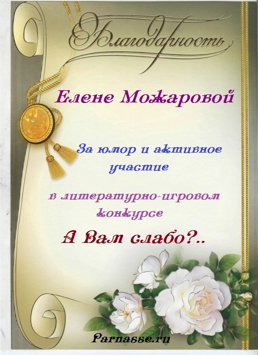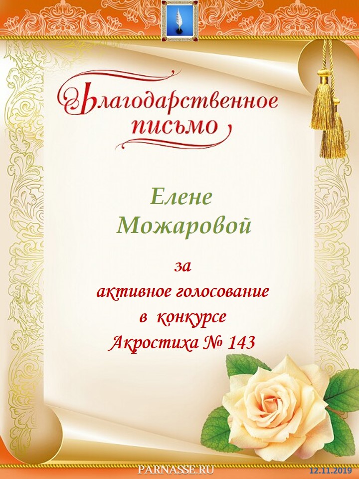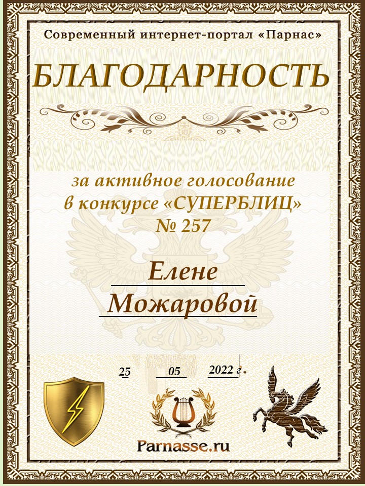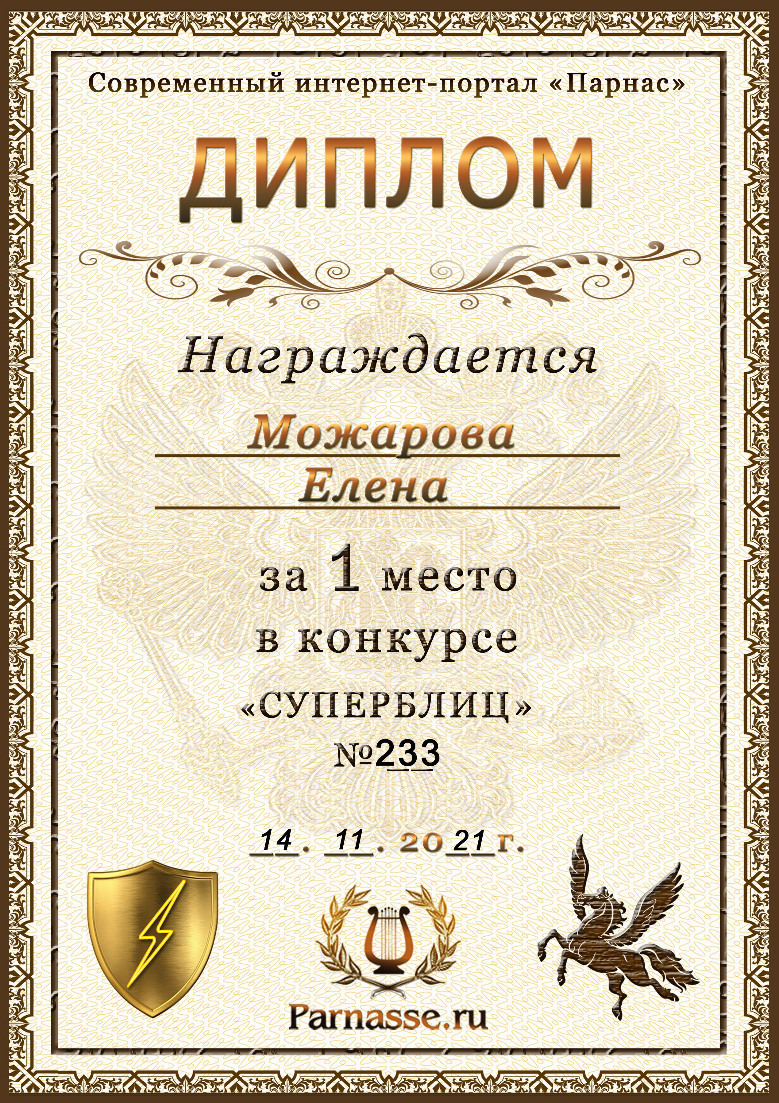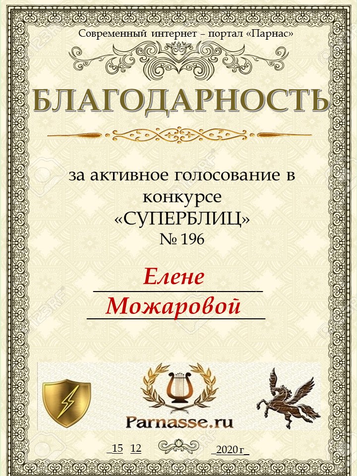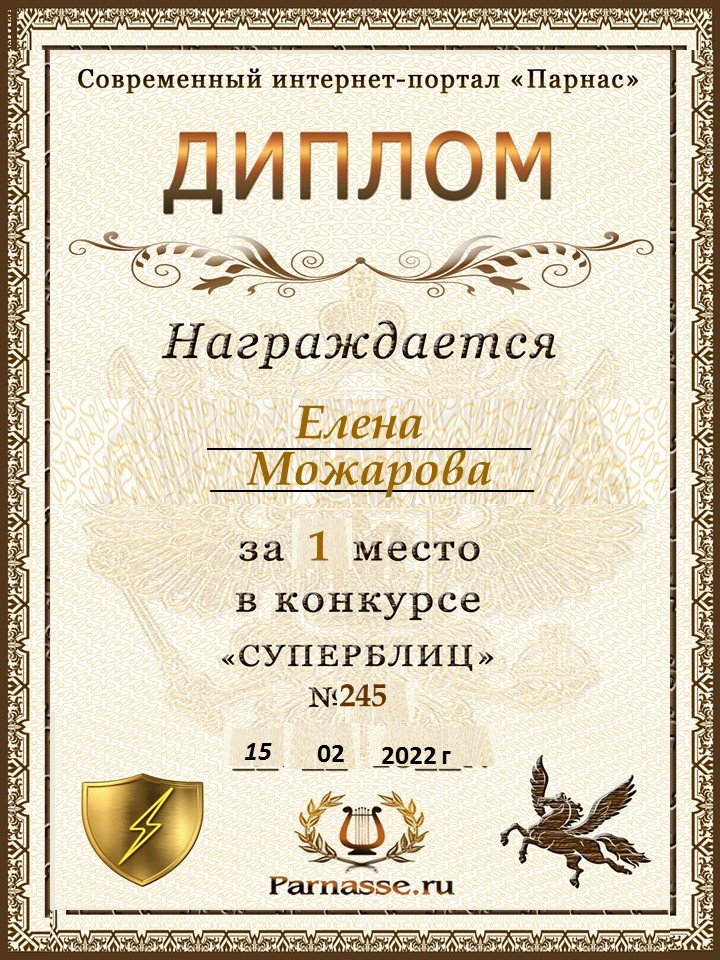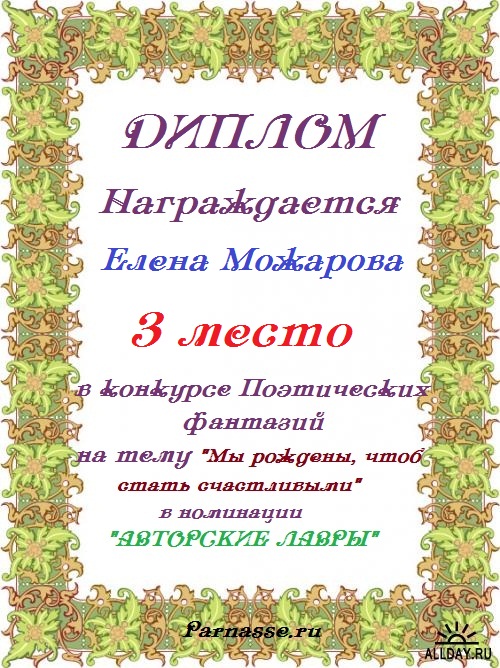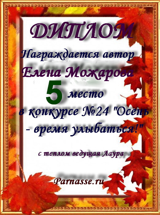 За неугасающую и неисчерпаемую творческую активность, постоянный контакт с Музой и признание сообществом "Парнасцев".От всей души желаем Вам, Елена, здоровья, любви, успехов, благополучия, удачи и творческого вдохновения!