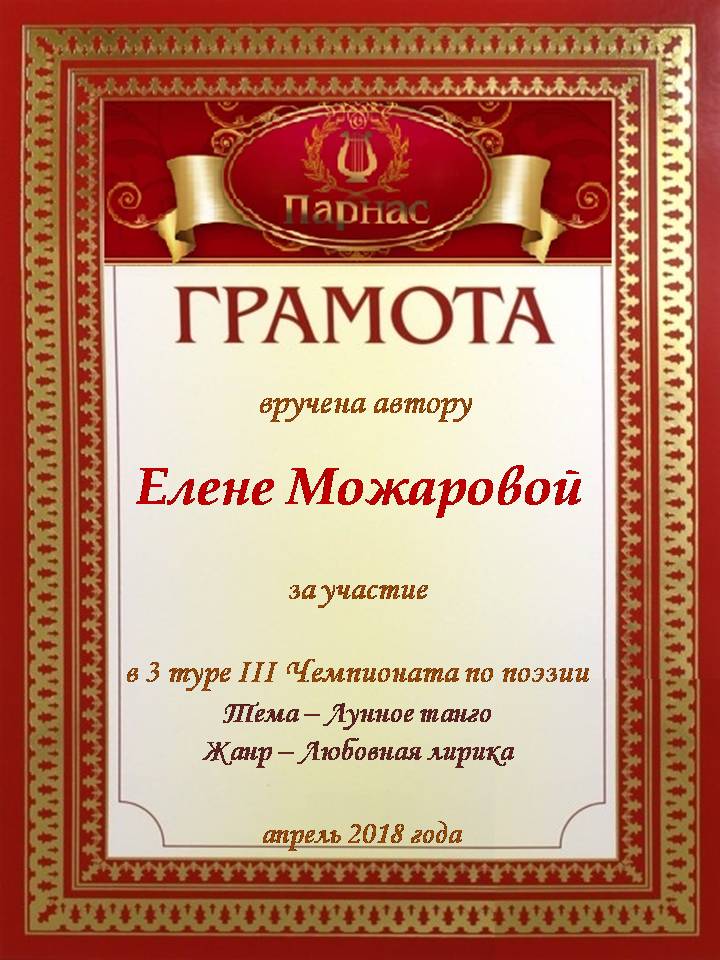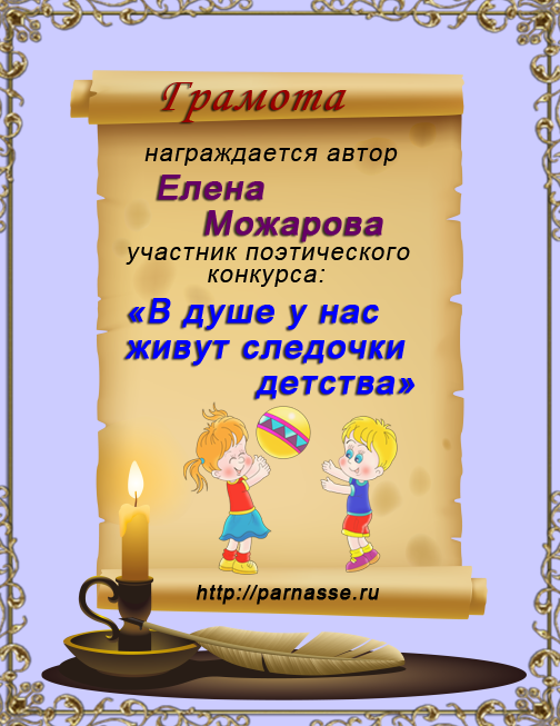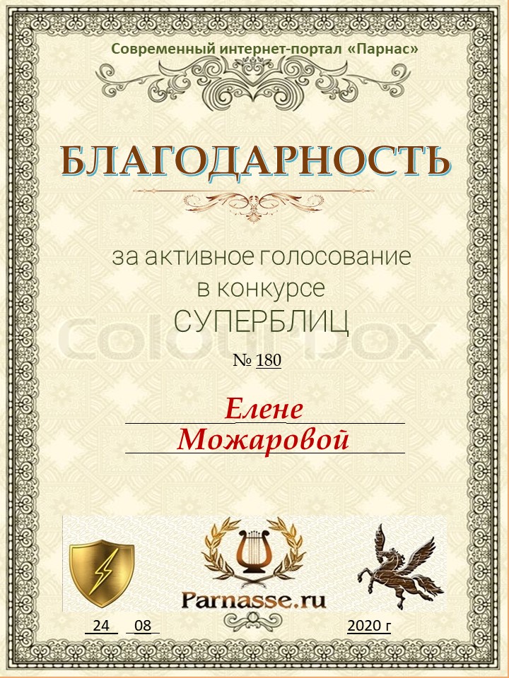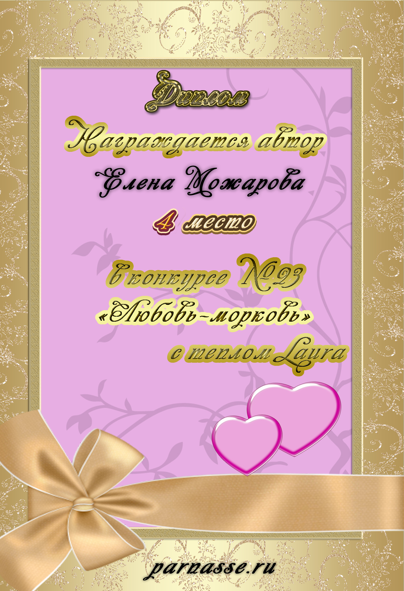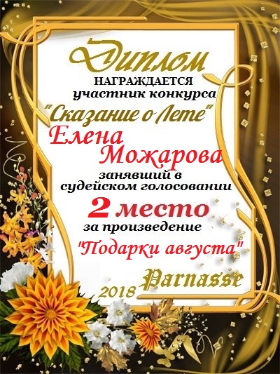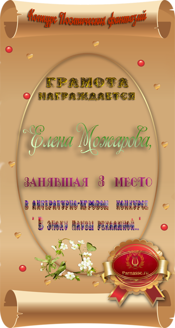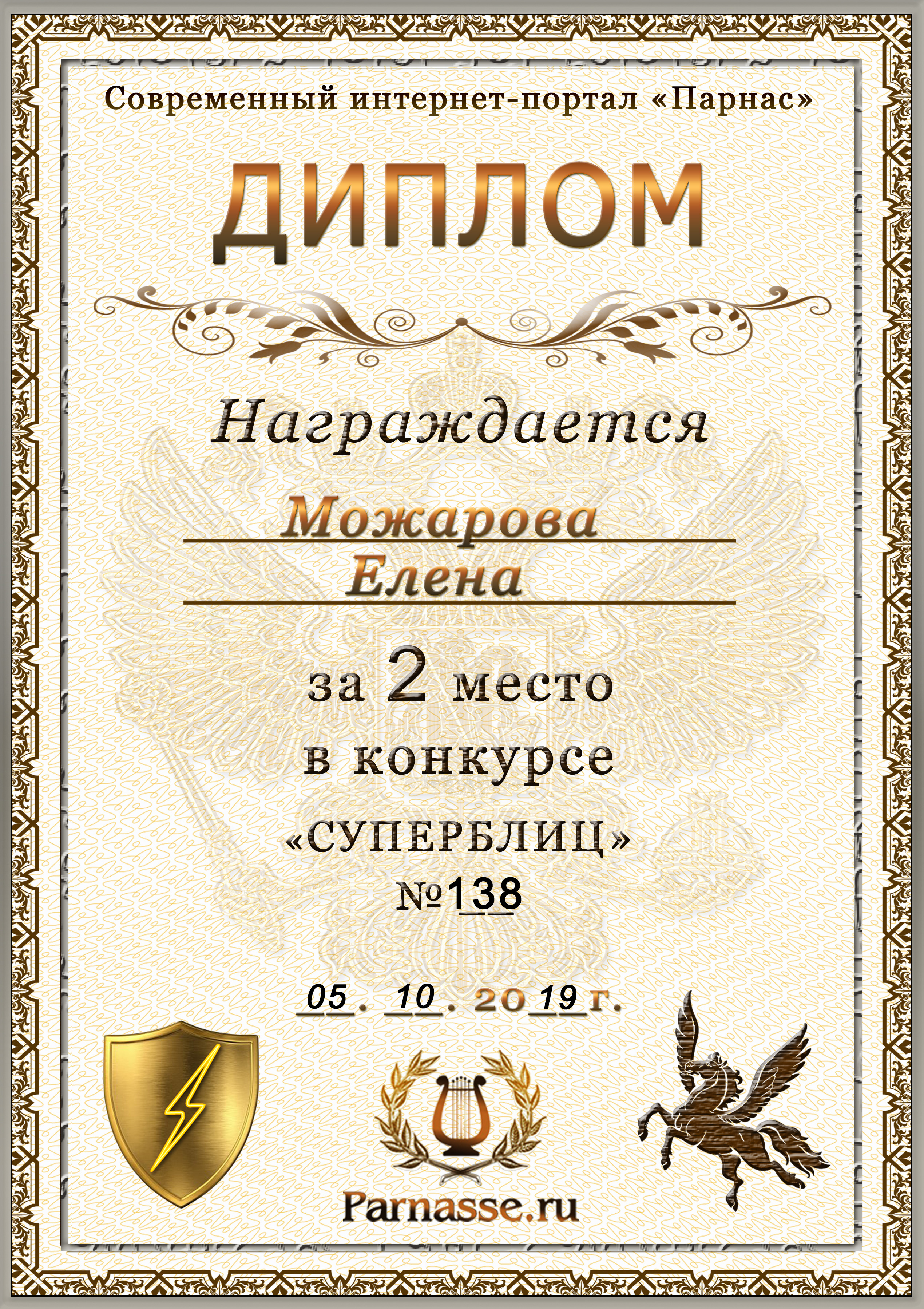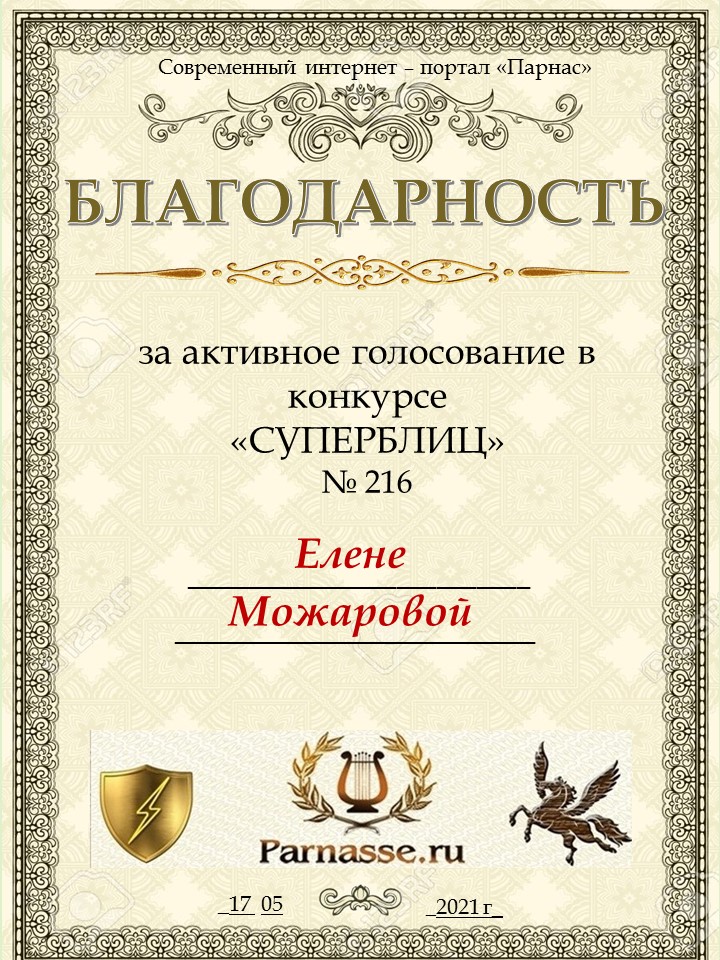 За неугасающую и неисчерпаемую творческую активность, постоянный контакт с Музой и признание сообществом "Парнасцев".От всей души желаем Вам, Елена, здоровья, любви, успехов, благополучия, удачи и творческого вдохновения!